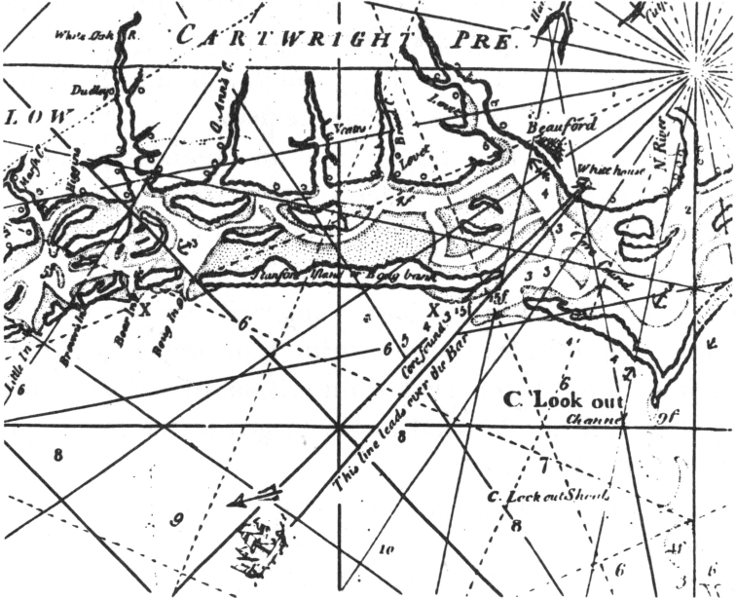 Through Albemarle Sound runs a dotted line indicating the course for ships. It may be seen where they could escape to or enter from the Atlantic through the narrow, hazardous Roanoke Inlet.