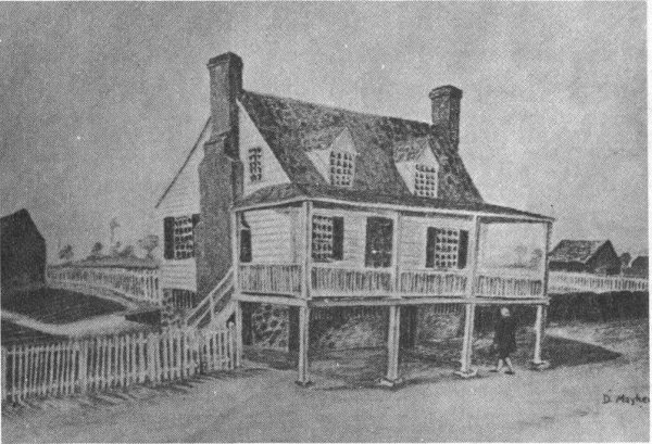 “D, Market House,” directly at the main intersection and adjacent to the courthouse, is shown as square. The “X” inscribed within this square perhaps indicates that the market had a pyramidal, four-sided roof. The building may have had open sides, like markets in certain other colonial towns. The open market building is an idea brought from Europe. Other buildings around this main intersection were stores or warehouses. At the southwest corner was Johnston and 13 Thackston’s store where Edmund Fanning, the Clerk of Court and a Tory leader, took refuge from the Regulators in 1770.