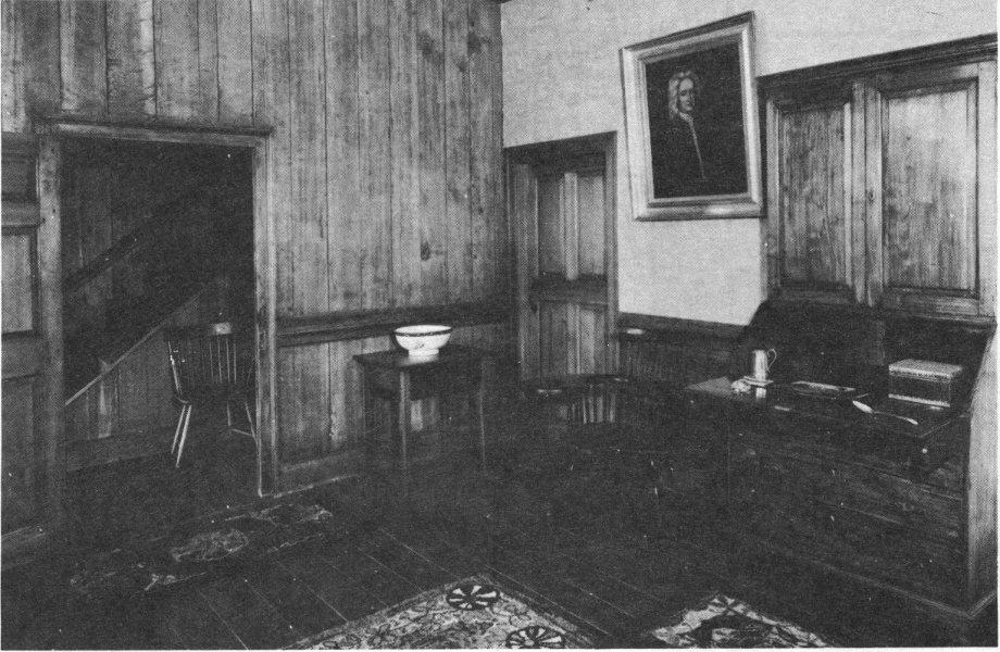 At the front of the house is the room planned for business. At various times through the years it was used for store, courtroom, and parlor. In the center of the house is a large hall room; it has two outside doors, and an open stairway to the second floor. The dotted line (· · ·) indicates a great, central beam used in the construction of the house, having the exceptional length of 51 feet. The dashed line (- - -) indicates the former location of a partition; the back bedrooms were lengthened at the expense of the hall. In the recent restoration of the house the location of the original partition was discovered, and it has been restored.