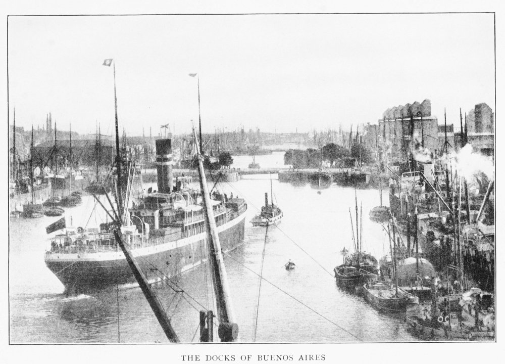 We have to anchor a mile from the shore, and a steam launch carrying the port officials soon comes alongside. The local boatmen, whose little craft, suited only to the quiet waters of the bay, bear no resemblance to the seaworthy surf boats of Pernambuco, line up at a distance of half a mile, awaiting the signal which permits them to hoist sail and race for{12} the steamer. It is a pretty sight, enlivened by the shouts of the boat crews. Some boats are loaded with delicious tropical fruits that are eagerly bargained for by our steerage passengers, most of whom are Spanish peasants on their way to harvest the crops of Argentina. Others are anxious to take us ashore. And after the usual delay, we make a deal with a boatman, a lazy fellow who wastes a lot of time trying to sail in against the wind while his more energetic competitors are rowing. On the way we pass half a dozen steamers and a few sailing vessels, and steer carefully between scores of huge lighters and dozens of smaller craft. In place of the steel steam cranes which we saw at Pernambuco, on the wharves are numerous wooden cranes worked by hand.