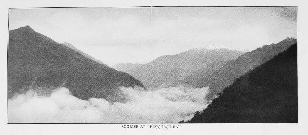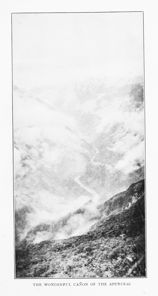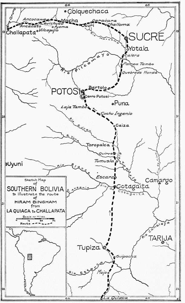 In September, 1908, I left New York as a delegate of the United States Government and of Yale University to the First Pan-American Scientific Congress, held at Santiago, Chile, in December and January, 1908-09. Before attending the Congress I touched at Rio de Janeiro and the principal coast cities of Brazil, crossed the Argentine Republic from Buenos Aires to the Bolivian frontier, rode on mule-back through southern Bolivia, visiting both Potosí and Sucre, went by rail from Oruro to Antofagasta, and thence by steamer to Valparaiso. After the Congress I retraced my steps into Bolivia by way of the west coast, Arequipa, and Lake Titicaca. Picking up the overland trail again at Oruro, I continued my journey across Bolivia and Peru, via La Paz, Tiahuanaco, and Cuzco, thence by mules over the old Inca road as far as Huancayo, the present terminus of the Oroya-Lima Railroad. At Abancay I turned aside to explore Choqquequirau, the ruins of an Inca fortress in the valley of the Apurimac; an excursion that could not have been undertaken at all had it not been for the very generous assistance of Hon. J. J. Nuñez, the Prefect of Apurimac, and his zealous aide, Lieutenant Caceres of the Peruvian army. I reached Lima in March, 1909.