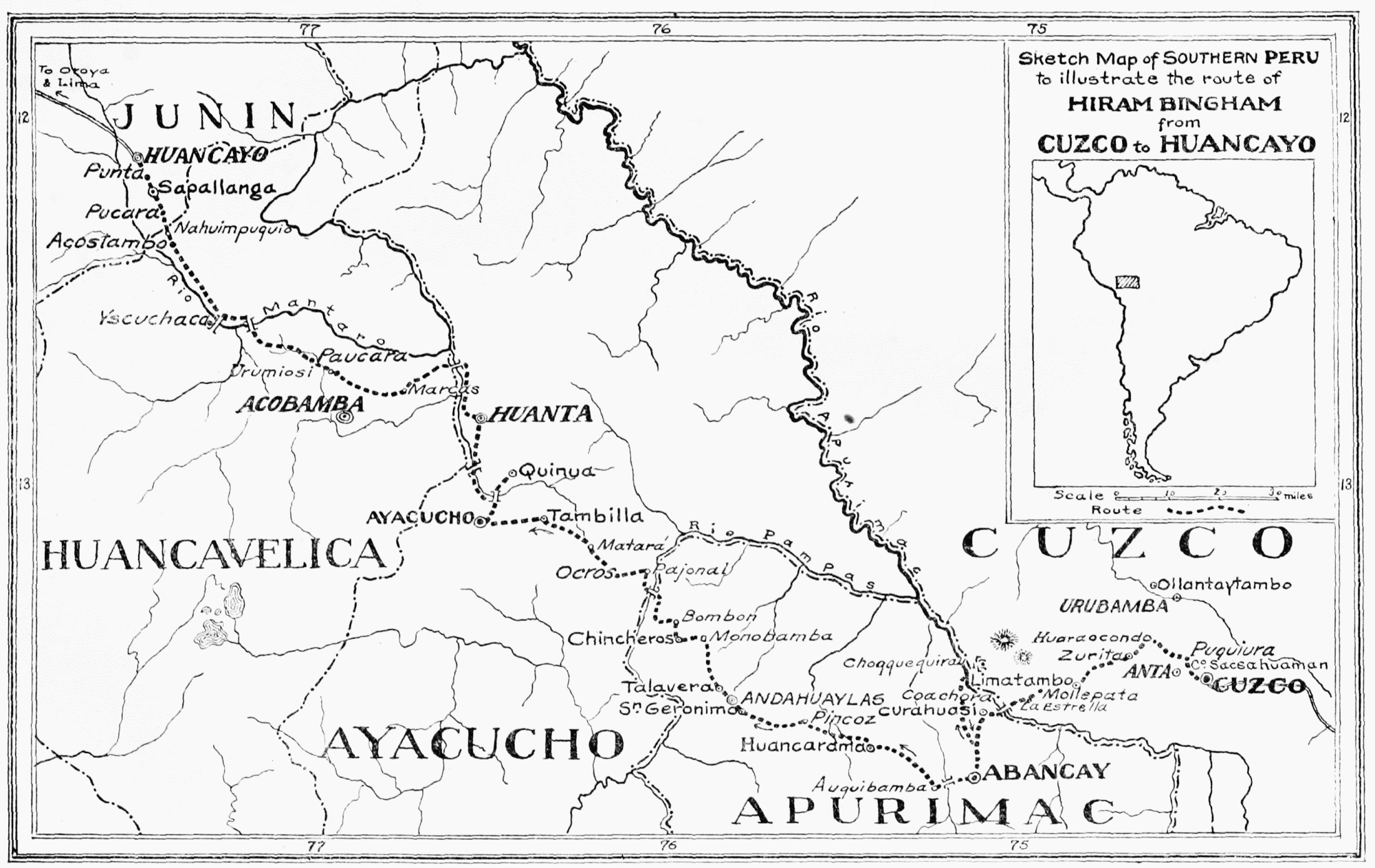 In September, 1908, I left New York as a delegate of the United States Government and of Yale University to the First Pan-American Scientific Congress, held at Santiago, Chile, in December and January, 1908-09. Before attending the Congress I touched at Rio de Janeiro and the principal coast cities of Brazil, crossed the Argentine Republic from Buenos Aires to the Bolivian frontier, rode on mule-back through southern Bolivia, visiting both Potosí and Sucre, went by rail from Oruro to Antofagasta, and thence by steamer to Valparaiso. After the Congress I retraced my steps into Bolivia by way of the west coast, Arequipa, and Lake Titicaca. Picking up the overland trail again at Oruro, I continued my journey across Bolivia and Peru, via La Paz, Tiahuanaco, and Cuzco, thence by mules over the old Inca road as far as Huancayo, the present terminus of the Oroya-Lima Railroad. At Abancay I turned aside to explore Choqquequirau, the ruins of an Inca fortress in the valley of the Apurimac; an excursion that could not have been undertaken at all had it not been for the very generous assistance of Hon. J. J. Nuñez, the Prefect of Apurimac, and his zealous aide, Lieutenant Caceres of the Peruvian army. I reached Lima in March, 1909.