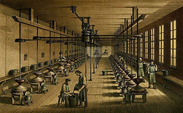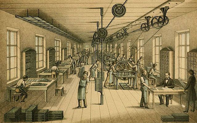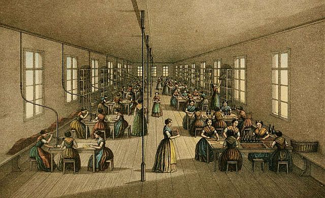 In the seventh plate to the right the workwomen are seen engaged in polishing the pencils with colours, and to the left those who by means of a lever press stamp the name of the firm upon them.