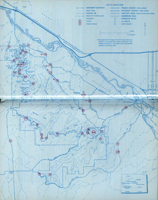 Later, after I had prepared popular style reports containing mostly color photographs on Canyonlands[3] and Arches[4] National Parks, officials of Colorado National Monument and I discussed the possibility of preparing a revised and enlarged edition of my 1965 report containing mainly color photographs, inasmuch as the supply of the black and white edition was nearing exhaustion, and later became out of print. At the meeting in the Monument on June 8, 1976, attended by Robert (Bob) E. Benton, Superintendent, A. J. (Jerry) Banta, Supervising Park Ranger, Margaret Short, Park Naturalist and Secretary of the Natural History Association, and me, it was agreed that: (1) A revised and enlarged edition containing mostly color photographs should be prepared for publication as a bulletin of the U.S. Geological Survey, and (2) that the XII Colorado and Black Canyon Natural History Association gave its permission for use of any or all of the copyrighted material in the first edition. The present report resulted.