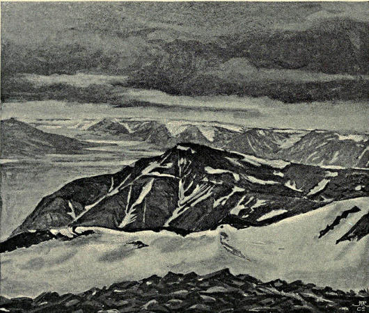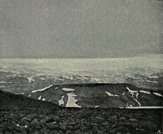 We returned to camp for our cameras and came back with Nielsen, then Garwood set forward down the hill to investigate the Hecla Hook rocks of the nunatak, whilst Nielsen and I went north up the snow-slope. We had not more than a mile to go before reaching the top of the highest snow-dome in the watershed area between the glacier systems draining west to Dickson Bay, south-east to Wybe Jans Water, and south to Klaas Billen Bay. Whether the glacier to the north bent ultimately west to Dickson Bay or round to the head of East Fjord of Wijde Bay could not be determined, for it was soon lost beneath a roof of cloud. The fulmar petrels that came flying over could have told us. The range of hills across the north was now clear. There were indications of a valley between our plateau and them, and of a pass leading over to it from a[40] bay of the eastern valley. Unfortunately my photographs of this important view, like all others taken by me on roller film this year, failed. How I now regret not to have carried some good glass plates to this point! Only blind notes remain. There was a peak of nearly 4000 feet, 30° west of north, and another due north about six miles away. Connected with them were many more of smaller dimensions. West of the peak first mentioned the land dropped below the cloud-level, which was from 500 to a 1000 feet beneath our feet. All in the Dickson Bay direction was hidden under piled masses of cloud.