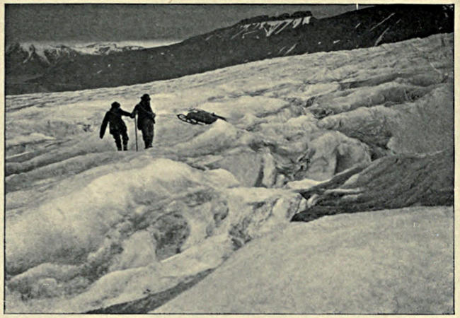 Our preparations being completed, we set forth up the Nordenskiöld Glacier, toward the unknown interior, on the morning of July 13. The first struggle up the steep, moraine-faced front of the glacier involved all our forces. The stones, lying upon ice, were loose and large. They slipped from under, or fell upon us. We took one sledge at a time and lightened it of half its burden, but still it was hard to drag. It wedged itself against rocks when pulled forward, but never seemed to find a stone to stop its backsliding. Our aim was to reach a tongue of hard snow in the upper part of a gully. Coming to it from the side, the sledge swung across and almost upset us all. At last we reached the top, returned for the second sledge, then (two or three times) for the bundles, and so finally gained our end after hours of toil. Once on more level ice, things went better, though not well. To begin with, the sledges were badly loaded and had to be rearranged. Then, though the surface of the ice sloped but[16] gently, it was very lumpy and the lumps turned the sledges this way and that. Garwood and I pulled one, the two men the other. Perspiration ran off us. Our estimate of the possible length of the day’s march diminished.