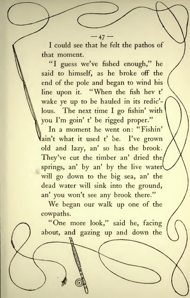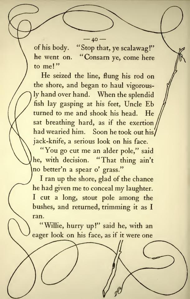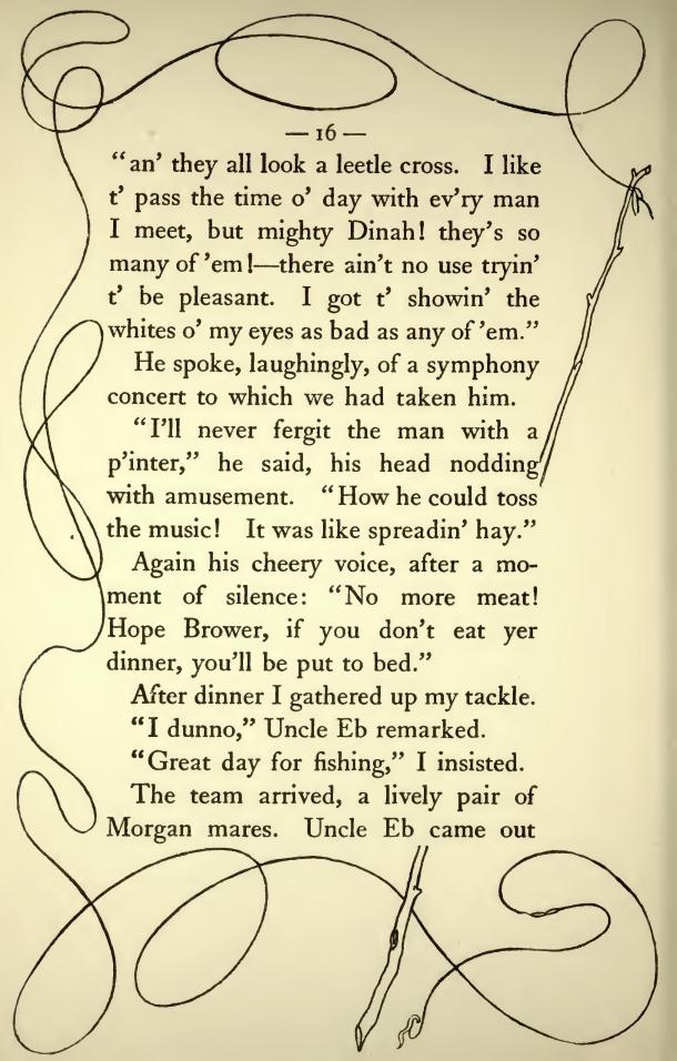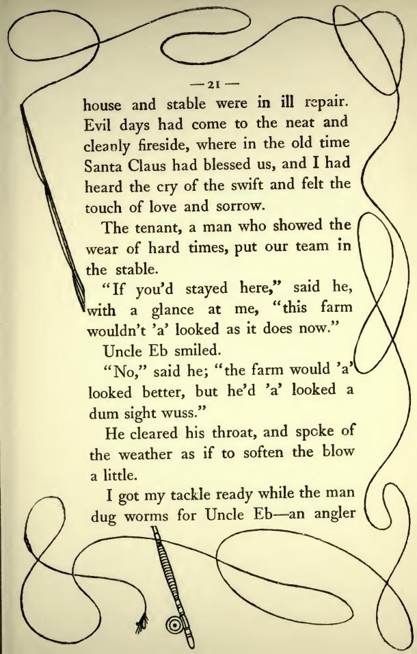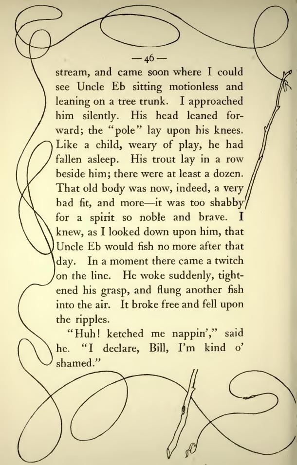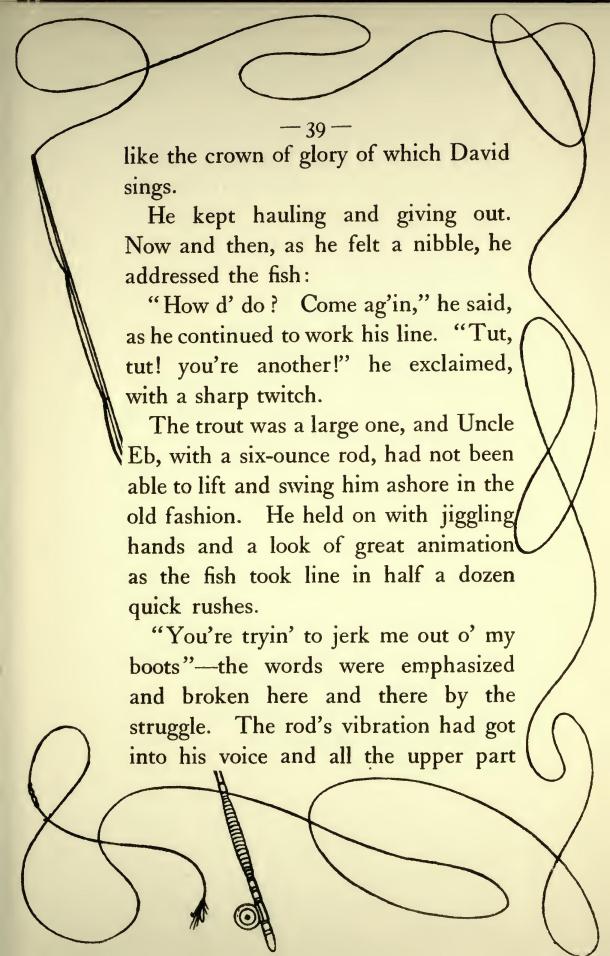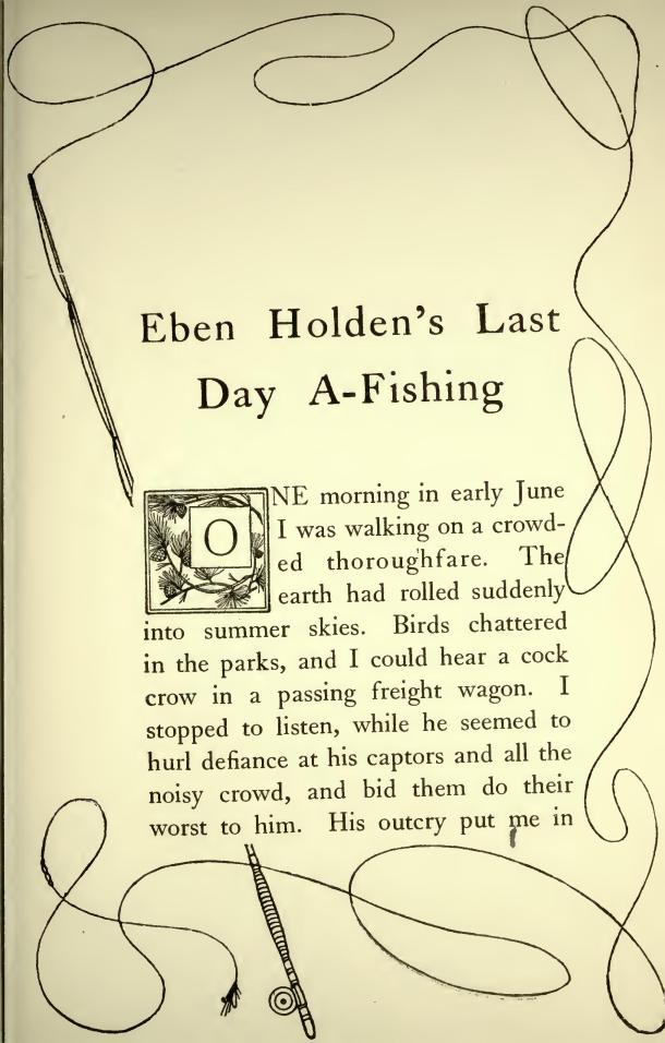 Project Gutenberg's Eben Holden's Last Day A-Fishing, by Irving Bacheller This eBook is for the use of anyone anywhere in the United States and most other parts of the world at no cost and with almost no restrictions whatsoever. You may copy it, give it away or re-use it under the terms of the Project Gutenberg License included with this eBook or online at www.gutenberg.org. If you are not located in the United States, you'll have to check the laws of the country where you are located before using this ebook. Title: Eben Holden's Last Day A-Fishing Author: Irving Bacheller Release Date: June 30, 2016 [EBook #52454] Last Updated: March 12, 2018 Language: English Character set encoding: UTF-8 *** START OF THIS PROJECT GUTENBERG EBOOK EBEN HOLDEN'S LAST DAY A-FISHING *** Produced by David Widger from page images generously provided by the Internet Archive