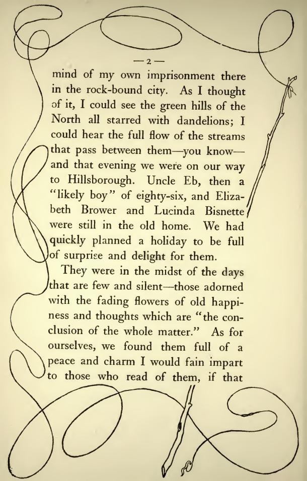 mind of my own imprisonment there in the rock-bound city. As I thought of it, I could see the green hills of the North all starred with dandelions; I could hear the full flow of the streams that pass between them—you know—and that evening we were on our way to Hillsborough. Uncle Eb, then a “likely boy” of eighty-six, and Elizabeth Brower and Lucinda Bisnette were still in the old home. We had quickly planned a holiday to be full of surprise and delight for them.