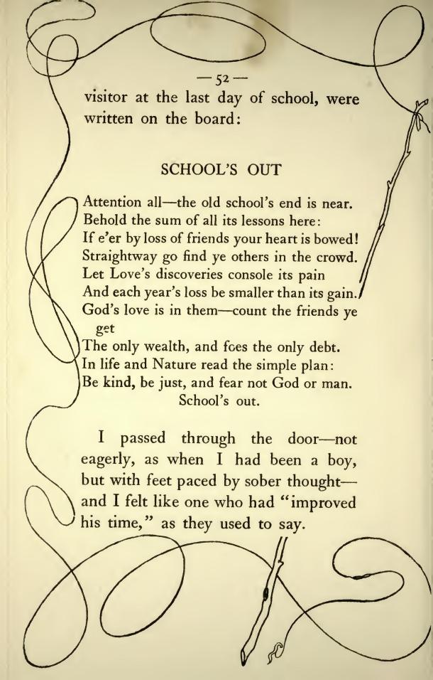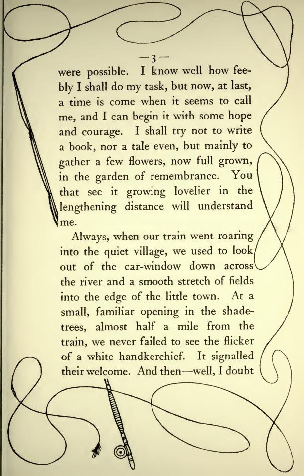 Always, when our train went roaring into the quiet village, we used to look out of the car-window down across the river and a smooth stretch of fields into the edge of the little town. At a small, familiar opening in the shade-trees, almost half a mile from the train, we never failed to see the flicker of a white handkerchief. It signalled their welcome. And then—well, I doubt