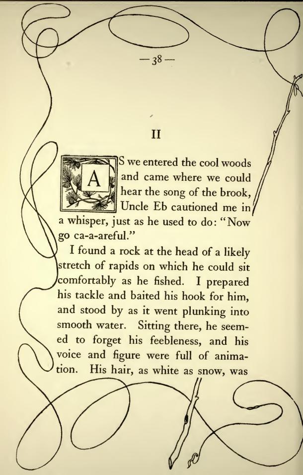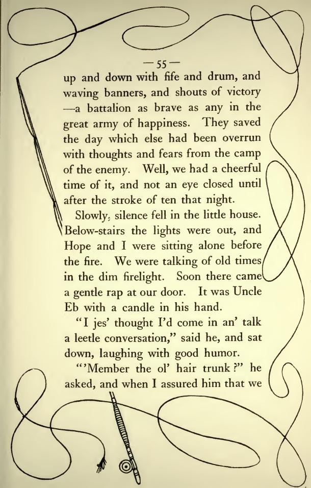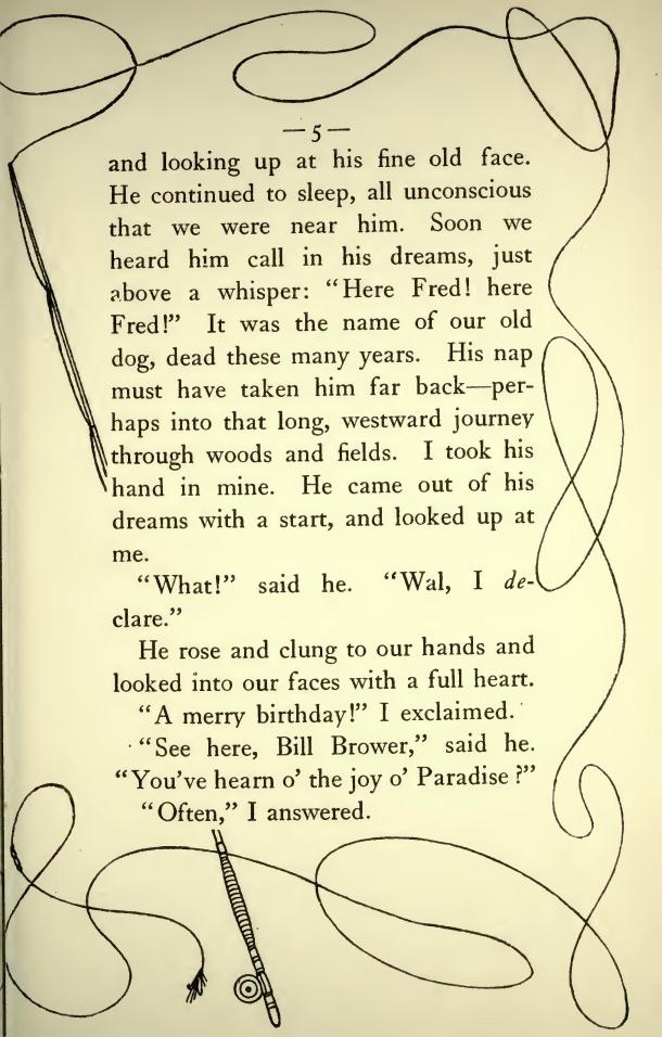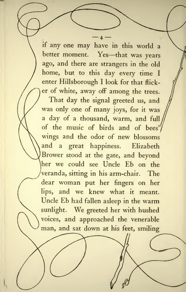 That day the signal greeted us, and was only one of many joys, for it was a day of a thousand, warm, and full of the music of birds and of bees' wings and the odor of new blossoms and a great happiness. Elizabeth Brower stood at the gate, and beyond her we could see Uncle Eb on the veranda, sitting in his arm-chair. The dear woman put her fingers on her lips, and we knew what it meant. Uncle Eb had fallen asleep in the warm sunlight. We greeted her with hushed voices, and approached the venerable man, and sat down at his feet, smiling