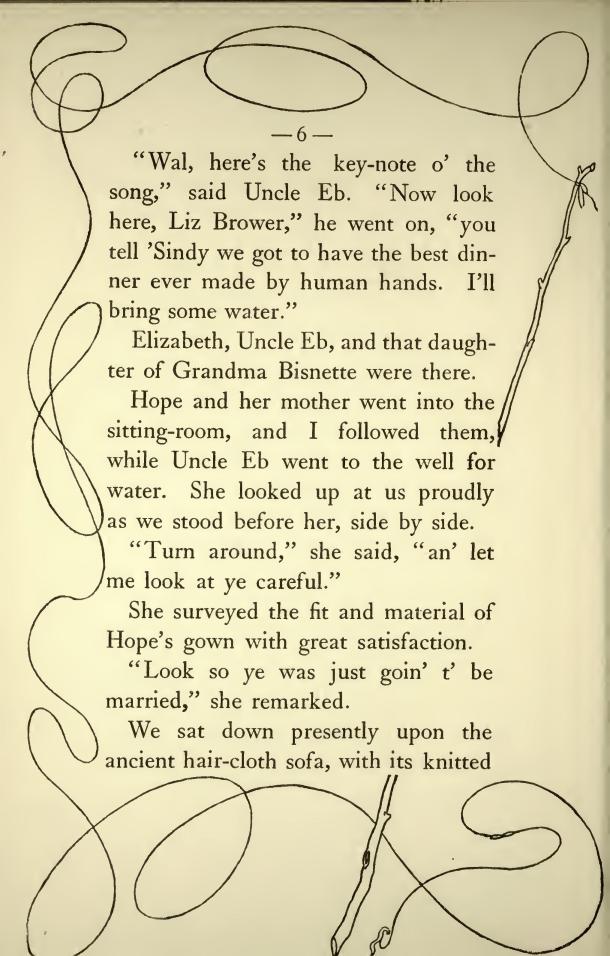 “Wal, here's the key-note o' the song,” said Uncle Eb. “Now look here, Liz Brower,” he went on, “you tell 'Sindy we got to have the best dinner ever made by human hands. I'll bring some water.”