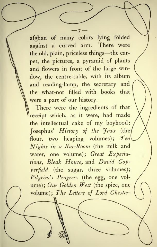 There were the ingredients of that receipt which, as it were, had made the intellectual cake of my boyhood: Josephus' History of the Jews (the flour, two heaping volumes); Ten Nights in a Bar-Room (the milk and water, one volume); Great Expectations, Bleak House), and David Copperfield (the sugar, three volumes); Pilgrim's Progress (the egg, one volume); Our Golden West (the spice, one volume); The Letters of Lord Chesterfield