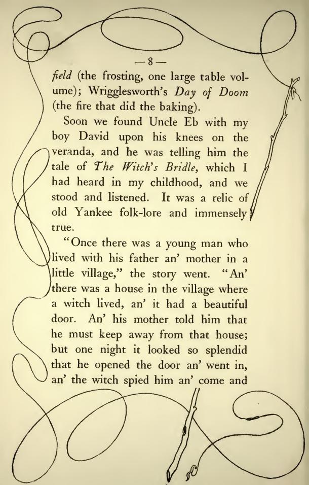 Soon we found Uncle Eb with my boy David upon his knees on the veranda, and he was telling him the tale of The Witch's Bridle, which I had heard in my childhood, and we stood and listened. It was a relic of old Yankee folk-lore and immensely true.