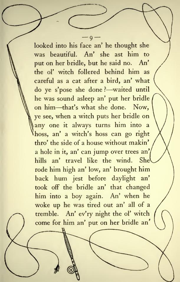 looked into his face an' he thought she was beautiful. An' she ast him to put on her bridle, but he said no. An' the ol' witch follered behind him as careful as a cat after a bird, an' what do ye s'pose she done?—waited until he was sound asleep an' put her bridle on him—that's what she done. Now, ye see, when a witch puts her bridle on any one it always turns him into a hoss, an' a witch's hoss can go right thro' the side of a house without makin' a hole in it, an' can jump over trees an' hills an' travel like the wind. She rode him high an' low, an' brought him back hum jest before daylight an' took off the bridle an' that changed him into a boy again. An' when he woke up he was tired out an' all of a tremble. An' ev'ry night the ol' witch come for him an' put on her bridle an'