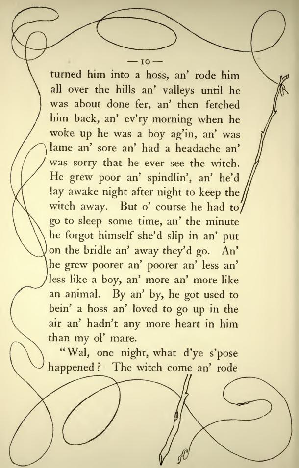 turned him into a hoss, an' rode him all over the hills an' valleys until he was about done fer, an' then fetched him back, an' ev'ry morning when he woke up he was a boy ag'in, an' was lame an' sore an' had a headache an' was sorry that he ever see the witch. He grew poor an' spindlin', an' he'd lay awake night after night to keep the witch away. But o' course he had to go to sleep some time, an' the minute he forgot himself she'd slip in an' put on the bridle an' away they'd go. An' he grew poorer an' poorer an' less an' less like a boy, an' more an' more like an animal. By an' by, he got used to bein' a hoss an' loved to go up in the air an' hadn't any more heart in him than my ol' mare.