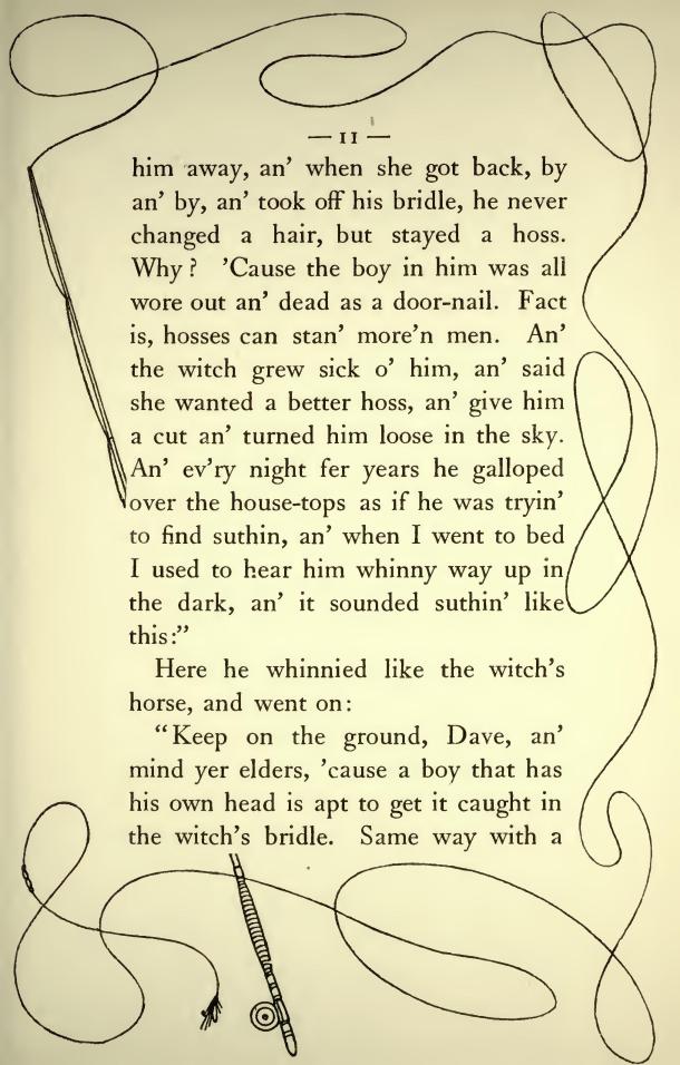 him away, an' when she got back, by an' by, an' took off his bridle, he never changed a hair, but stayed a hoss. Why? 'Cause the boy in him was all wore out an' dead as a door-nail. Fact is, hosses can stan' more'n men. An' the witch grew sick o' him, an' said she wanted a better hoss, an' give him a cut an' turned him loose in the sky. An' ev'ry night fer years he galloped over the house-tops as if he was tryin' to find suthin, an' when I went to bed I used to hear him whinny way up in the dark, an' it sounded suthin' like this:”