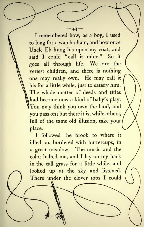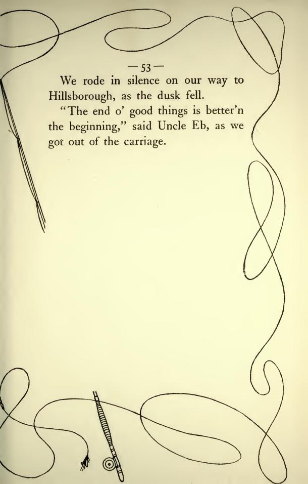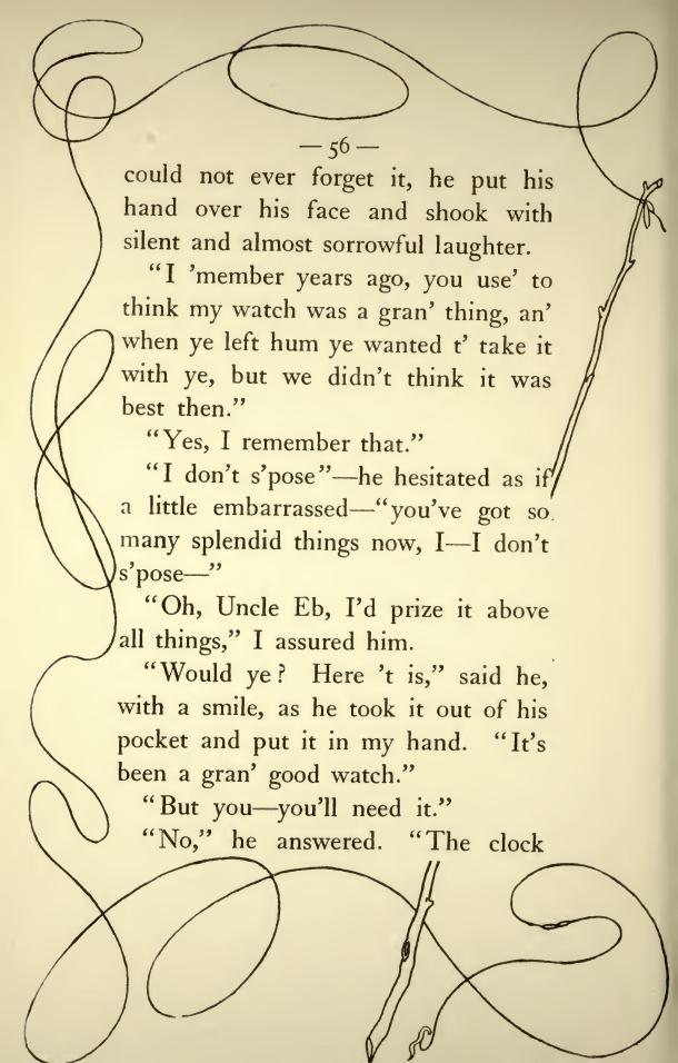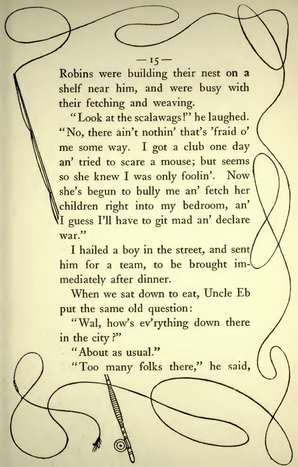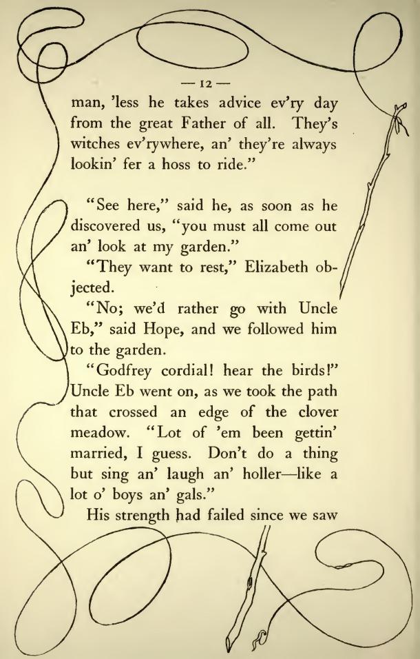 “Godfrey cordial! hear the birds!” Uncle Eb went on, as we took the path that crossed an edge of the clover meadow. “Lot of 'em been gettin' married, I guess. Don't do a thing but sing an' laugh an' holler—like a lot o' boys an' gals.”
