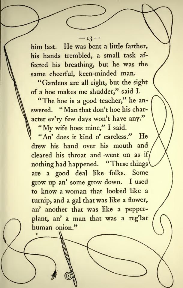 “An' does it kind o' careless.” He drew his hand over his mouth and cleared his throat and went on as if nothing had happened. “These things are a good deal like folks. Some grow up an' some grow down. I used to know a woman that looked like a turnip, and a gal that was like a flower, an' another that was like a pepper-plant, an' a man that was a reg'lar human onion.”