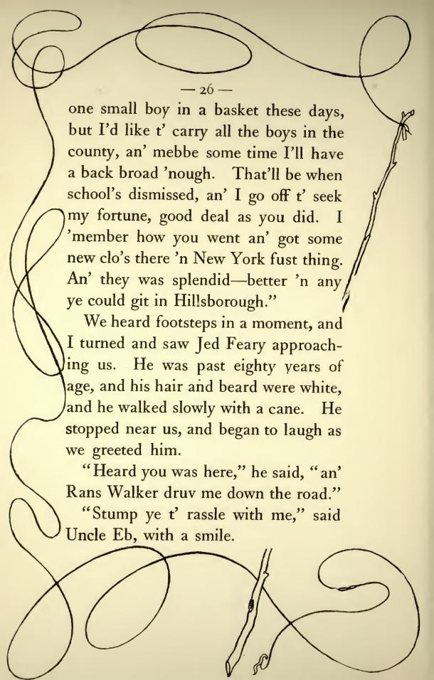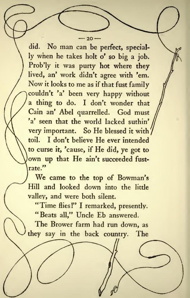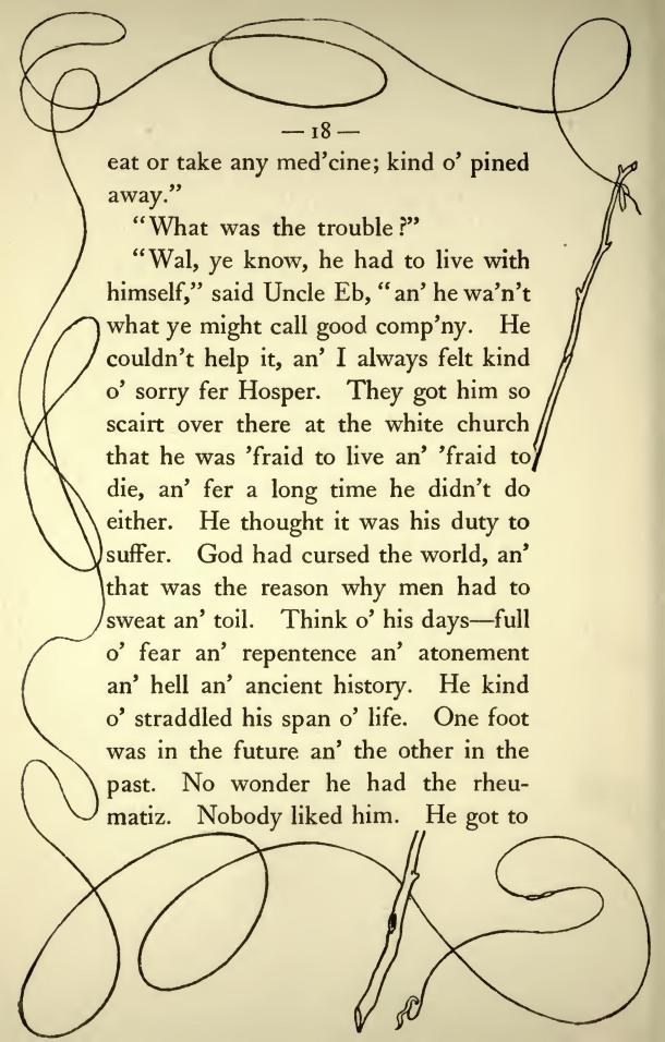 “Wal, ye know, he had to live with himself,” said Uncle Eb, “an' he wa'n'. what ye might call good comp'ny. He couldn't help it, an' I always felt kind o' sorry fer Hosper. They got him so scairt over there at the white church that he was 'fraid to live an' 'fraid to die, an' fer a long time he didn't do either. He thought it was his duty to suffer. God had cursed the world, an' that was the reason why men had to sweat an' toil. Think o' his days—full o' fear an' repentence an' atonement an' hell an' ancient history. He kind o' straddled his span o' life. One foot was in the future an' the other in the past. No wonder he had the rheumatiz. Nobody liked him. He got to