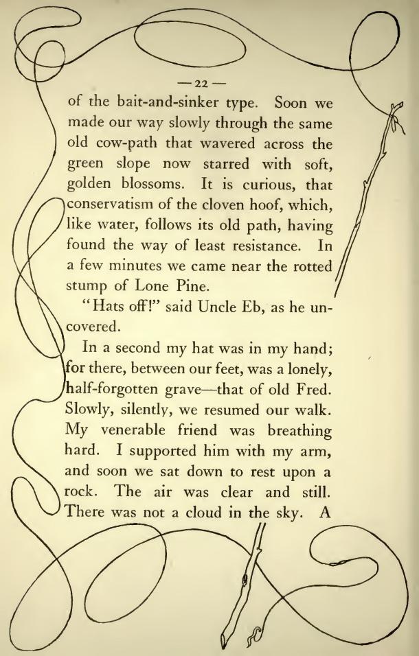 of the bait-and-sinker type. Soon we made our way slowly through the same old cow-path that wavered across the green slope now starred with soft, golden blossoms. It is curious, that conservatism of the cloven hoof, which, like water, follows its old path, having found the way of least resistance. In a few minutes we came near the rotted stump of Lone Pine.