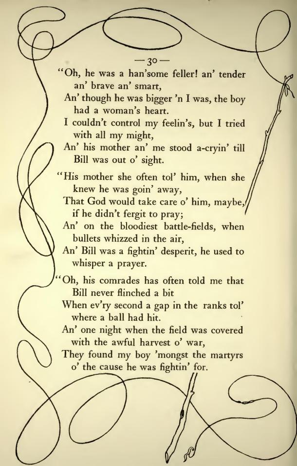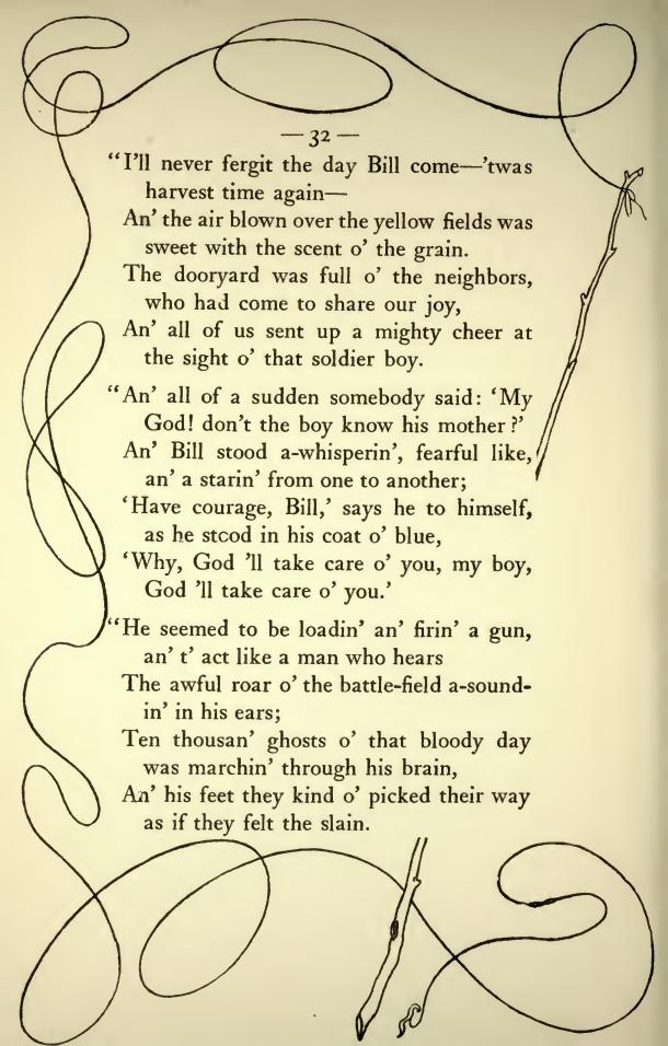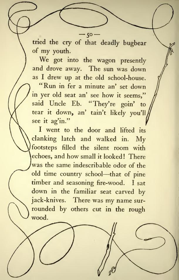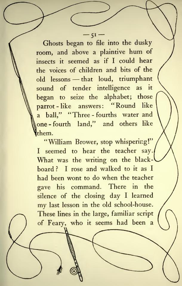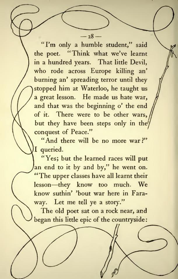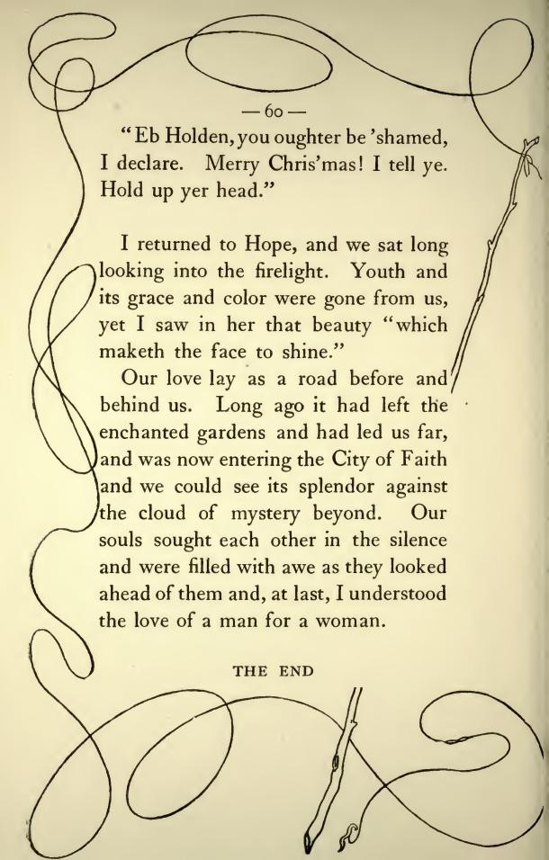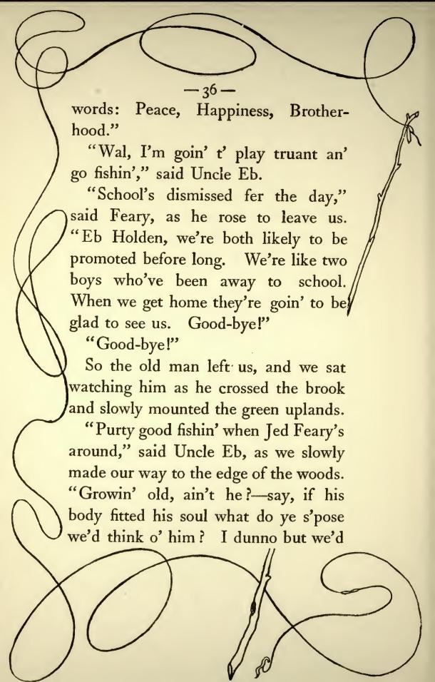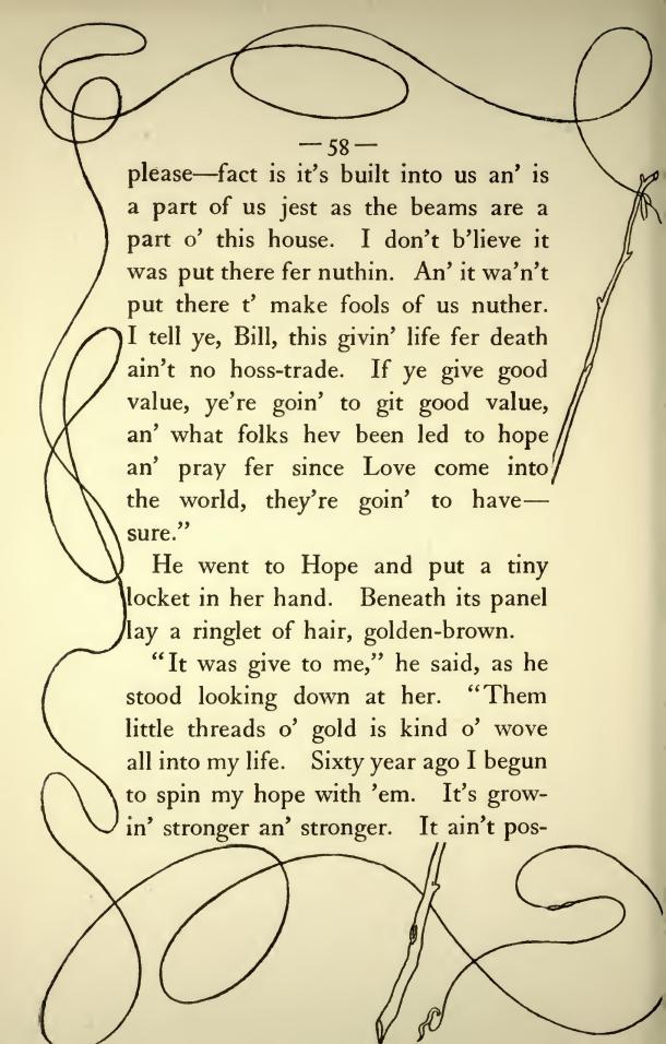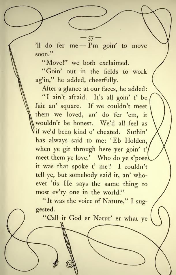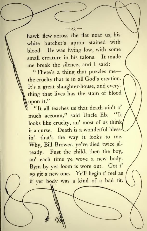 “It all teaches us that death ain't o' much account,” said Uncle Eb. “It looks like cruelty, an' most of us think it a curse. Death is a wonderful blessin'—that's the way it looks to me. Why, Bill Brower, ye've died twice already. Fust the child, then the boy, an' each time ye wove a new body. Bym by yer loom is wore out. Got t' go git a new one. Ye'll begin t' feel as if yer body was a kind of a bad fit.