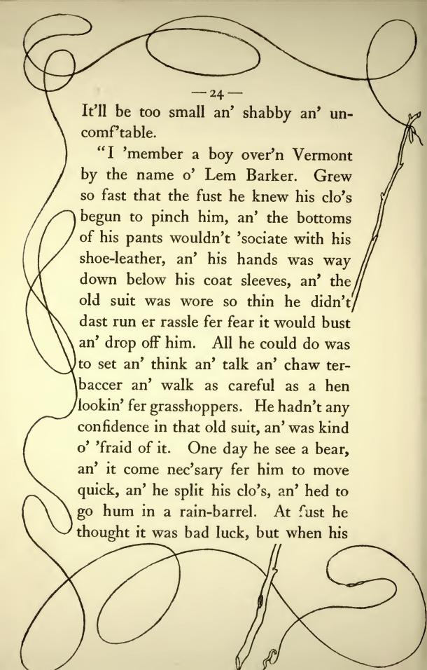 “I 'member a boy over'n Vermont by the name o' Lem Barker. Grew so fast that the fust he knew his clo's begun to pinch him, an' the bottoms of his pants wouldn't 'sociate with his shoe-leather, an' his hands was way down below his coat sleeves, an' the old suit was wore so thin he didn't dast run er rassle fer fear it would bust an' drop off him. All he could do was to set an' think an' talk an' chaw ter-baccer an' walk as careful as a hen lookin' fer grasshoppers. He hadn't any confidence in that old suit, an' was kind o' 'fraid of it. One day he see a bear, an' it come nec'sary fer him to move quick, an' he split his clo's, an' hed to go hum in a rain-barrel. At fust he thought it was bad luck, but when his