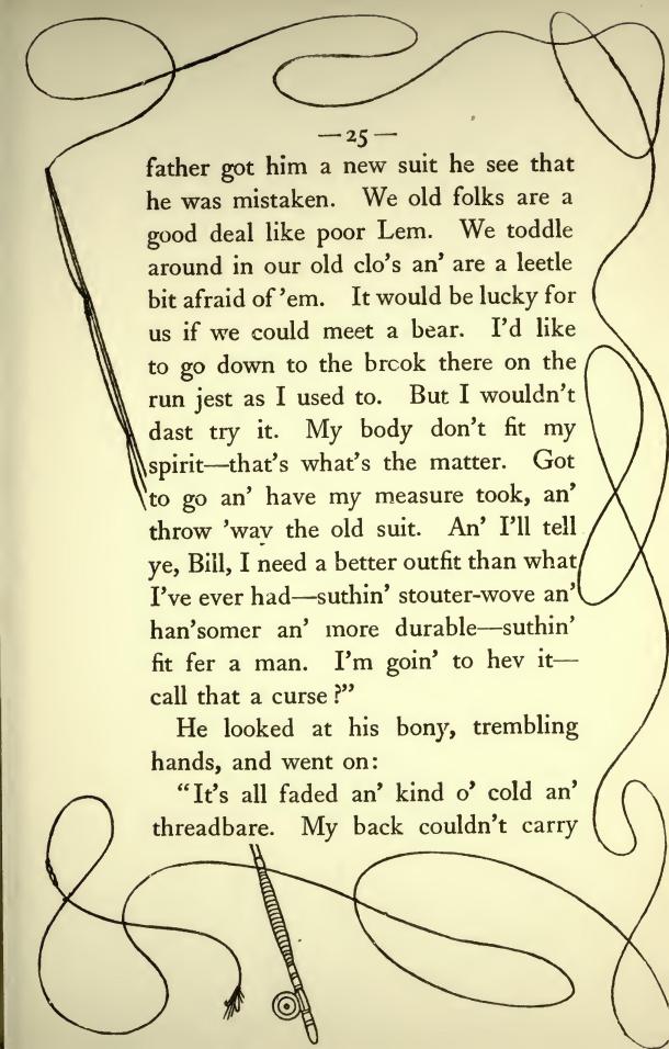 father got him a new suit he see that he was mistaken. We old folks are a good deal like poor Lem. We toddle around in our old clo's an' are a leetle bit afraid of 'em. It would be lucky for us if we could meet a bear. I'd like to go down to the brook there on the run jest as I used to. But I wouldn't dast try it. My body don't fit my spirit—that's what's the matter. Got to go an' have my measure took, an' throw 'way the old suit. An' I'll tell ye, Bill, I need a better outfit than what I've ever had—suthin' stouter-wove an' han'somer an' more durable—suthin' fit fer a man. I'm goin' to hev it—call that a curse?”