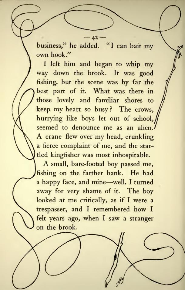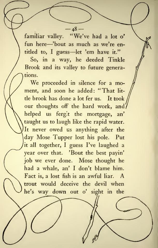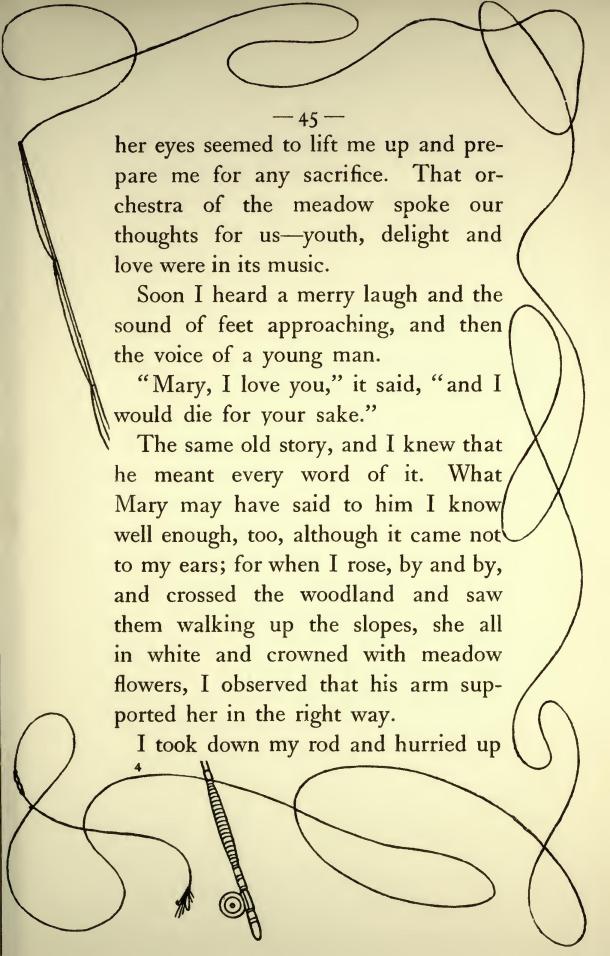“You quit!” he answered, with a little gesture of impatience. “Say!” he suggested, with enthusiasm, after a moment, “I wouldn't wonder but what the fish would bite—ye take it on the rapids there.”