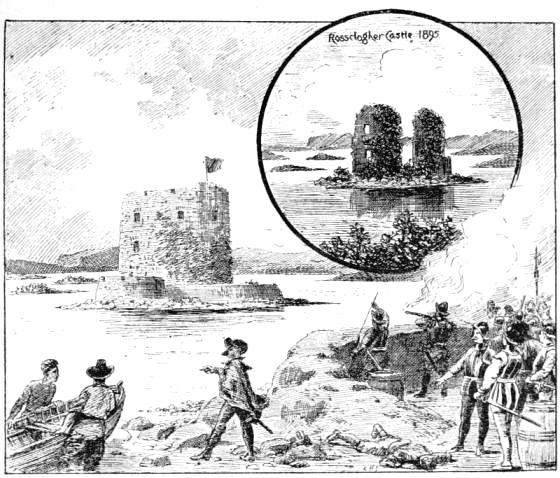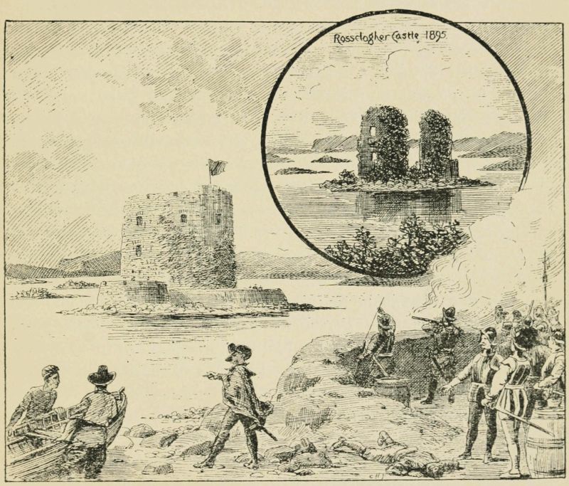 The Irish name of this family was MacFhlnncdaha, the name being variously written in the State Papers as McGlannogh, McGlanthie, etc., while in the Spanish narrative it is Manglana. In a map drawn in 1609, the territory is marked "Dartrie MacGlannagh" (which see). The MacClancys were chiefs, subject to O'Rourke, and their territory—a formidable one, by reason of its mountains and fastnesses—comprised the entire of the present barony of Rossclogher. According to local tradition, which survived when O'Donovan visited the district in the summer of 1836[3], the extent of "Dartree MacClancy" was from Glack townland on the east to Bunduff[16] on the west—a distance of about six miles; and from Mullinaleck townland on the north to Aghanlish on the south—a distance of about three miles. The townlands of Rossfriar (Ross-na-mbraher, i.e., the Peninsula of the Friars), and that now called Aghanlish, were ancient termon lands appertaining to the church of Rossclogher, the ruins of which stand on the mainland, close to the island castle of our narrative. The romantic and beautiful district over which the MacClancys held sway included Lough Melvin, with its islands and the mountain range behind. Within its bounds were two castles—that of Rossclogher and Dun Carbery. On the island of Iniskeen was MacClancy's crannog; and here it may be pointed out a frequent error has been made in supposing that the Castle of Rossclogher stood on Iniskeen. The crannog was on that large island which is far to the east of the Castle of Rossclogher. This was merely used in troublous times as a place of security—a sort of treasure-house; but not an ordinary dwelling-place. Besides the buildings already mentioned within the territory, were at least three monasteries—that of Doire-Melle, Cacair-Sinchill, and Beallach-in-Mithidheim—as well as numerous churches, the ruins of some being still in existence. The MacClancy clan appear to have sprung from a stock totally distinct from the neighbouring clans of Brefney. Their chief residence was at Rossclogher, but they had another castle—that of Dun Carbery—some ruins of which are still standing close to the village of Tullaghan. This was built in the sixteenth century, and a more commanding site for a fortified house it would have been difficult to select. It was built on the summit of an extensive Dun, or fort, which belonged to a period long anterior to the MacClancy rule; and it is a noticeable fact that the name of the original owner of the Dun Carbery, son of Niall of the Nine Hostages (fifth century), has continued to the present day as the name by which the castle is known.
