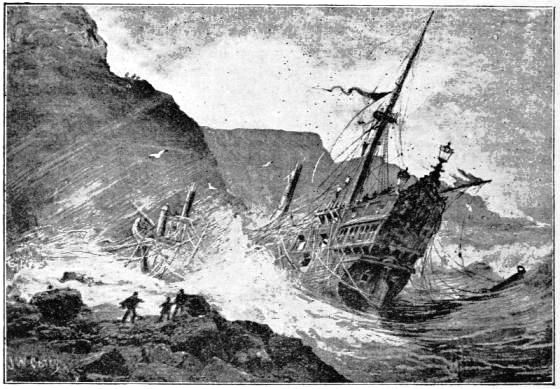 But Cuellar was no longer left in command of the San Pedro: he henceforward sailed in the vessel of the Judge Advocate, who was also styled Provost Marshal. Having passed round the north coast of Scotland, the vessel in which Cuellar was, in company with two other ships—all of large tonnage—encountered head winds and rough weather. Passing Tory Island, they were endeavouring to clear Erris Head on the Mayo coast; but the storms increasing, and the sea running high, they were unable to make that point. With shattered spars and torn canvas, and a weight of water in their holds, which the constant working of the pumps could hardly keep under, these vessels in a rough sea were unmanageable, and, drifting downwards, found themselves enbayed off the Sligo coast, where they hoped to find temporary anchorage. In the sailing instructions given by the Duke of Medina to the Spanish vessels on their return home, the following occurs: "The course that is first to be held is to the north-north-east, until you be found under 61 degrees and a half, and then to take great heed lest you fall upon the Island of Ireland, for fear of the harm that may happen unto you upon that coast. Then parting from those islands, and doubling the Cape in 61 1⁄2 degrees, you shall run west-south-west, until you be found under 58 degrees, and from thence to the south-west," etc. These particulars are valuable in showing the direction in which the Spaniards endeavoured to navigate their unwieldy craft. Captain Duro in his book refers to the frequency of the opening of the seams in the old Spanish ships, which defect he attributes to the excessive weight and height of the masts, whose leverage in heavy weather caused a strain on the hulls which necessitated the constant employment of caulkers.