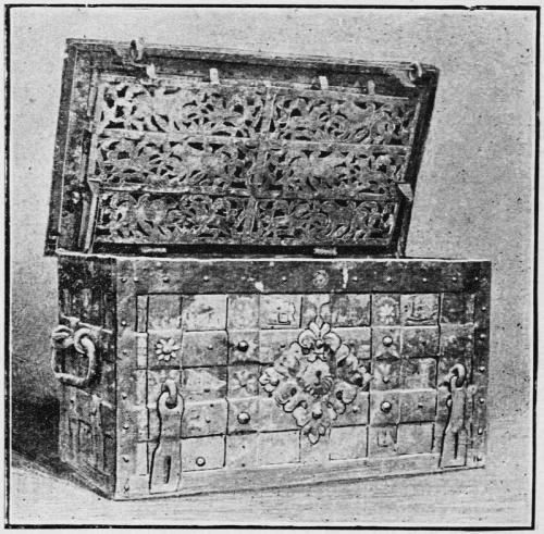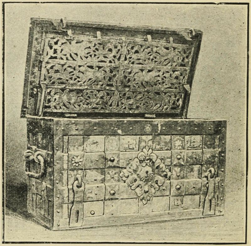 In State Papers [4th and 5th August, 1588], in describing the capture of a Spanish "Carrack"—the San Salvador—it is said: "This very night some inkling came unto us that a chest of great weight should be found in the fore-peak of the ship," etc. These and many other references to both treasure and treasure-chests, taken from contemporary sources, show that the Spanish treasure-chests are not mythical, but formed a necessary part of the outfit of an expedition, on which those who had entered had staked all their riches and had brought their valuables with them. A fine specimen of the treasure-chest is in the possession of Major Hamilton, Brownhall. It has been in his family for such a period that its history is lost. The ornamental open-work of polished steel, which covers the inside of lid, is a very fine specimen of mediæval iron work.
