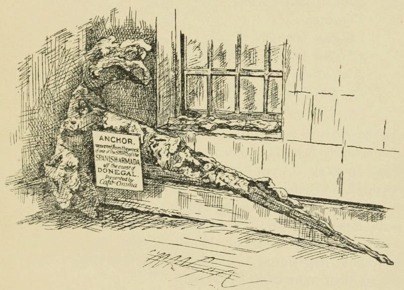 In the spring of 1895, an attempt was made to search for the remains of this ship. A small steamer, called the Harbour Lights, visited the spot, and remained for a fortnight, but without being able to accomplish anything. Owing to the accumulation of sand, which now covers the wreck, there are great obstacles in the way of reaching it. At about a distance of two miles to the south of the "Spanish Rock" another vessel was wrecked, in the Bay of Castlefort, inside of the North Island of Aran. In 1853, the coastguards at Rutland, under the superintendence of their chief officer, Mr. Richard Heard, and at the instance of Admiral Sir Erasmus Ommanney, C.B., who was on a tour of inspection in that year, had their attention directed to the wreck. The search was rewarded by the recovery of a fine anchor, which was forthwith transmitted to London, and presented by the Admiral to the United Service Institution, Whitehall Place. Through the kindness of Sir Erasmus Ommanney, an engraving[11] of this interesting relic is presented, and the writer is also indebted to[34] him for the particulars of the discovery of the anchor. A portion of one of the brass cannon recovered from the Girona was in Castlecaldwell Museum, till the collection was disposed of. The fine figurehead of one of the ships wrecked off Streedagh, which is shown on the first page, is the only existing specimen in Ireland. In the Parish Church of Carndonagh is a bell, which tradition says was recovered from an Armada vessel wrecked at Inishowen. It bears the following legend: "Sancta: Maria: Ora: Pro: Nobis Ricardus Pottar [his sign or trade mark] De Vruain Me Fecit Alla [Allelujah]."