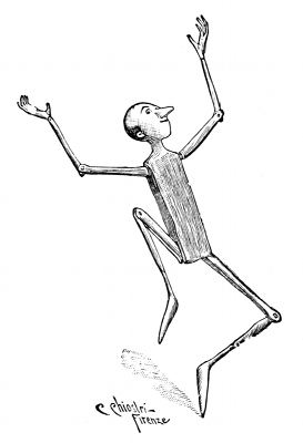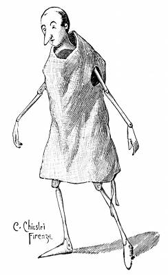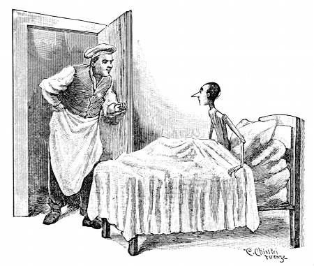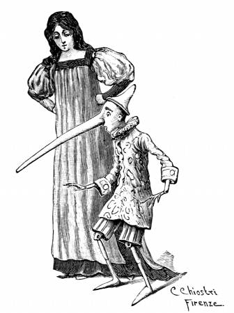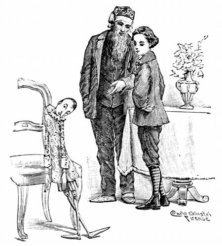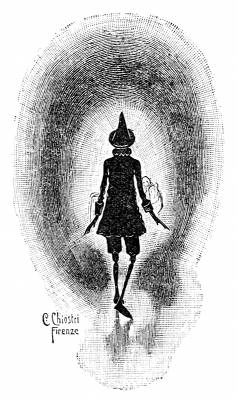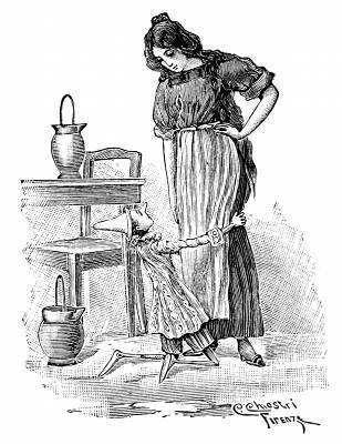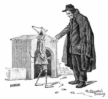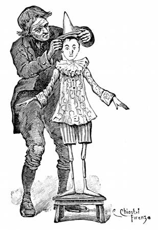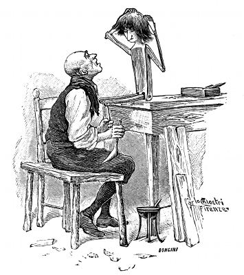 Girò gli occhi smarriti intorno alla stanza per vedere di dove mai poteva essere uscita quella vocina, e non vide nessuno! Guardò sotto il banco, e nessuno: guardò dentro un armadio che stava sempre chiuso, e nessuno; guardò nel corbello dei trucioli e della segatura, e nessuno; aprì l'uscio di bottega per dare un'occhiata anche sulla strada, e nessuno. O dunque?...