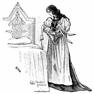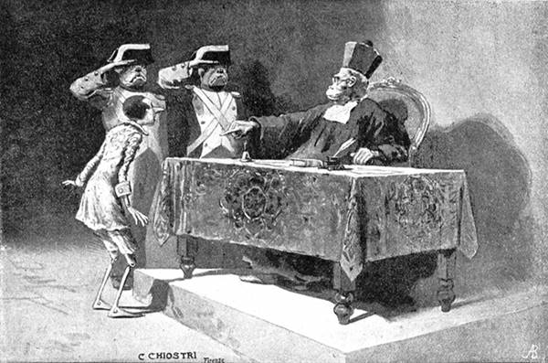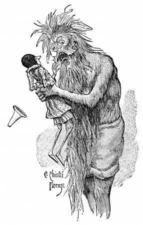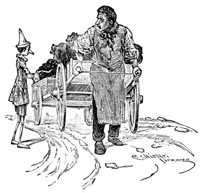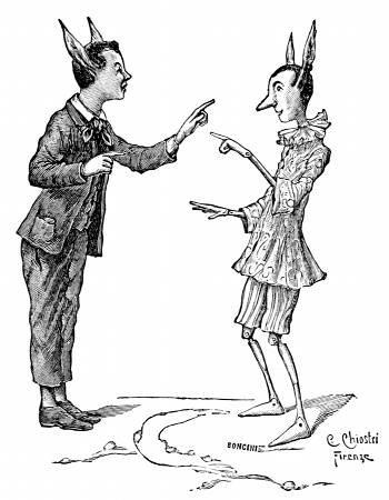 — Ma di dove sarà uscita questa vocina che ha detto ohi?... Eppure qui non c'è anima viva. Che sia per caso questo pezzo di legno che abbia imparato a piangere e a lamentarsi come un bambino? Io non lo posso credere. Questo legno eccolo qui; è un pezzo di legno da caminetto, come tutti gli altri, e a buttarlo sul fuoco, c'è da far bollire una pentola di fagioli.... O dunque? Che ci sia nascosto dentro qualcuno? Se c'è nascosto qualcuno, tanto peggio per lui. Ora l'accomodo io! —
