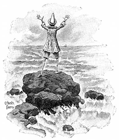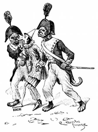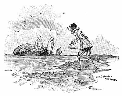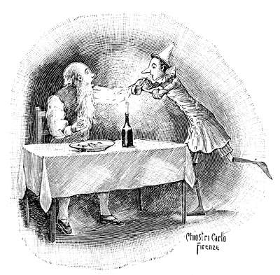 Questa volta maestro Ciliegia restò di stucco, cogli occhi fuori del capo per la paura, colla bocca [8] spalancata e colla lingua giù ciondoloni fino al mento, come un mascherone da fontana.