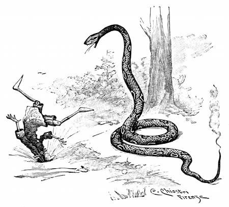 Detto fatto, prese subito l'ascia arrotata per cominciare a levargli la scorza e a digrossarlo; ma quando fu lì per lasciare andare la prima asciata, rimase col braccio sospeso in aria, perchè sentì una vocina sottile sottile, che disse raccomandandosi: