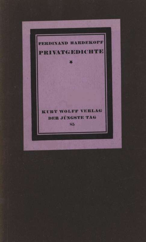 The Project Gutenberg EBook of Privatgedichte, by Ferdinand Hardekopf This eBook is for the use of anyone anywhere at no cost and with almost no restrictions whatsoever. You may copy it, give it away or re-use it under the terms of the Project Gutenberg License included with this eBook or online at www.gutenberg.org/license Title: Privatgedichte Author: Ferdinand Hardekopf Release Date: July 3, 2016 [EBook #52490] Language: German Character set encoding: ISO-8859-1 *** START OF THIS PROJECT GUTENBERG EBOOK PRIVATGEDICHTE *** Produced by Jens Sadowski and the Online Distributed Proofreading Team at http://www.pgdp.net