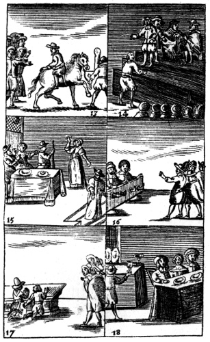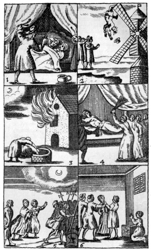 With much hazard, and greater fear, escaping their hands, only in his shirt, without shooe or stocking, he got out into the streets; and being overjoy’d that he was secure, but had the black mantle of night to conceal his shame, and convey him home, without the knowledge of the Town inhabitants, ran through the 41streets with all speed imaginable; but, by the way, meeting with a sharp stone, it so hurt his foot, that he was compell’d to slacken his pace, and lamely limp to his lodging. The Clock had then struck twelve (an hour wherein supposed Bugg-bears walk, to frighten Children) as he could see just before him two women, whom a third had raised from their warm beds by her incessant cries, proceeding from the intollerable pains she then indured, being ready to be delivered, to hasten to call up a fourth, viz. a Midwife. Haste on both sides had made them so carelesly heedless in their way, that they were within a spit and a stride of each other, before they could discern one the other. My cheating, and cheated Leacher perceived the women first, which put him to a stand, what he were best to do, either to go forward, or backward; they, on the other side, seeing a thing all in white stand opposit in their way, judged it to be the troubled spirit of the lately diseased Husband of this woman they were going to fetch the Midwife for. He, on the other hand, resolved to go forward; and they seeing him approach them (skreeking out) ran back as fast as they could; who being stopt by the watch, and demanded why they made that hideous outcry, made answer, they had met the Devil, or some thing like him. Condemning the womens idle and causless fears (as they judged) they advanced forwards, armed with Bills, Halberts, but principally with an unparallell’d resolution. My Gallant had stept into a by-corner, when the woman cried out to secure himself from what might ensue that unexpected allarum, fully resolved to run home to his lodging directly, with what speed he might; he started out just as the Watch were advanc’d within half Pistol-shot of him; the sudden surprize confirmed them in the womens report, so that, without consideration there was 42not one of these desperate Kill-Devils to be seen, but such as with a too precipitate haste, lay tumbling in the Kennel, one over the other. This accident gave new wings to my Lovers feet, which were so benumm’d with cold, that he very much stood in need of such Icarian practices, Dædalian inventions.