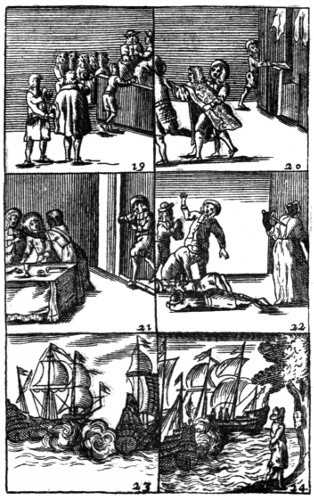 Although (said this old Trot) my Husband, and my black friend had quickly dispatch’t their business, by thus dispatching one another, yet they were neither so sudden nor so silent, but I both heard and saw them tilt at one another with their swords, which were bathed in each others heart blood; and so they fell, grinning at each other with horrible Countenances and they lay so close together, that they could catch hold of one another, and fight with their hands, their swords being sheathed in one anothers bodies; but this contest could not, neither did it last long, their hearts being suffocated with Blood, and so in short time they both expired; which I discovered by the noise of hollow groans: and thus continued she, was I deprived of a Friend, and a Husband. I was startled at the present, but considering what was to be done, went to bed, and lay there till some of the house came and bounc’d at my Chamber door; I suffered them to continue knocking for some time, as if I had been asleep; but they growing more furious by reason of my silence, were ready to break open the door, when I jumped out of my bed, and in my smock opening the door, asked them what was the cause of their violent knocking; they replyed, they were glad to see me 24alive, which they much doubted, by reason of my silence, and having seen such a doleful sight as was then in the Garden: I seeming ignorant of all, desired them to explain themselves, and acquaint me with their meaning; they were not long then ere they had told me, that my Husband and the Black-more who quartered at my Fathers, were both dead in the Garden: I was amazed, ran then to the window, and there beheld what I too well knew already; and then cryed out, and in lamentable and furious manner threw my self on the floor, tearing my hair, and making great lamentation; by this time the Constable and other Neighbors were come, but could not get any thing out of me to discover any knowledge of the fact. I seemed a stranger to all; and so the Bodies being removed, word was sent to my Father and Mother, who quickly came thither; but finding me, as the rest, to pretend ignorance, nothing could be done; but the People conjectured variously, and though they could not accuse me as the murtherer, yet I was shrewdly suspected to be the cause; they judging the truth as it was: but however, I was without the compass of the law, and therefore escaped all trouble.