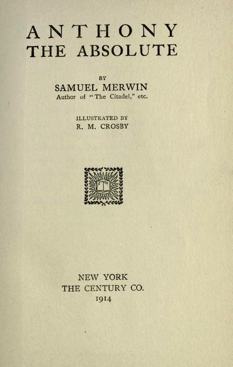 The Project Gutenberg EBook of Anthony The Absolute, by Samuel Merwin This eBook is for the use of anyone anywhere in the United States and most other parts of the world at no cost and with almost no restrictions whatsoever. You may copy it, give it away or re-use it under the terms of the Project Gutenberg License included with this eBook or online at www.gutenberg.org. If you are not located in the United States, you'll have to check the laws of the country where you are located before using this ebook. Title: Anthony The Absolute Author: Samuel Merwin Illustrator: R. M. Crosby Release Date: August 5, 2016 [EBook #52507] Last Updated: March 13, 2018 Language: English Character set encoding: UTF-8 *** START OF THIS PROJECT GUTENBERG EBOOK ANTHONY THE ABSOLUTE *** Produced by David Widger from page images generously provided by the Internet Archive