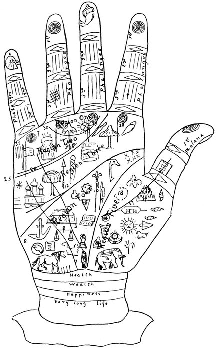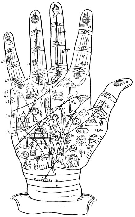 Cheiromancy, the art of foretelling the events of life by the lineaments of the hand, derived its name from the Greek word cheiros, the palm, and manteia, to foretell, whence it has been vulgarly called Palmistry—as it is named in a recent Act of Parliament to forbid its practice for gain or reward. In Coleman's Mythology of the Hindoos, p. 202, it is written: "On the Buddha's foot is the mark called the 'chakravarti,' wheel or discus, which should have been on the palm of the hand, by which the sages at his birth divined that he would rise to considerable eminence." He says (p. 19): "Various data have been assigned to the period of Buddha's existence. The most correct seems to be about 550 B.C., whence, as the sages practised cheiromancy at Buddha's birth, its existence must have been much earlier known among the Indians." "In the year 1652," writes Zadkiel, "the celebrated astrologer, Geo. Wharton, Esq., published a translation of 'a matchless piece' as vihe terms it, on the subject, written in Latin by Dr. J. Rothman." Since that period the art of cheiromancy has gradually fallen into disuse, chiefly from the extensive nonsense published by recent writers. One of the writers makes a shallow attempt to disprove the connection which exists between astrology and palmistry, while another says it is based on the principles of the Kabalah, the latter being nothing more than a mnemonical system of astrology. From the writings of Dr. J. Rothman and Geo. Wharton, Esq., I propose now to give, together with some of the choicest of those of the East, the principal matter, and to explain in the ordinary language used by palmisters such points as may require elucidation. Mr. Wharton, a careful student in these subjects, clearly proves that palmistry can only act in accordance with astrology, and that the art of cheiromancy cannot be relied upon beyond the period of from one to two years at most, for he observes in his preface, "What more convincing than if, by inspection made into the hand of any man, I truly pronounce this or that planet essentially dignified or angular in his geniture, or in such or such a position with other planets or stars, another unfortunate, afflicted or defected? Or if, on the contrary, by looking first into the geniture and considering therein the several positions of viithe planets and their configurations one to another and with other stars, I tell him, and that distinctly and truly, the lines and signatures engraven upon his head or hand—what, I say, is or can be more satisfactory than this to rational men, as touching the power and influence of the planets and stars upon these inferiors, and consequently of the lawful use and truth of the science called astrology, cheiromancy and metoposcopia, between which three sciences there appear to be such a secret coherence and harmony?"