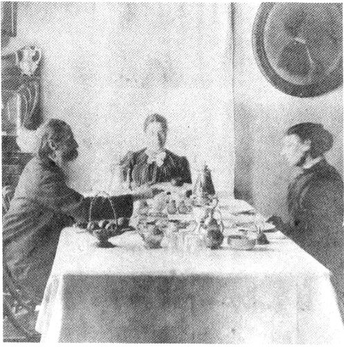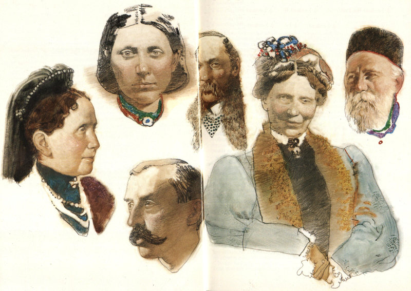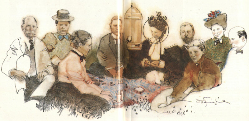 The figures are, from left to right: Grand Duchess Louise of Baden, Antoinette Margot, George Kennan, Julian Hubbell, Clara Barton, and Jean-Henri Dunant.
