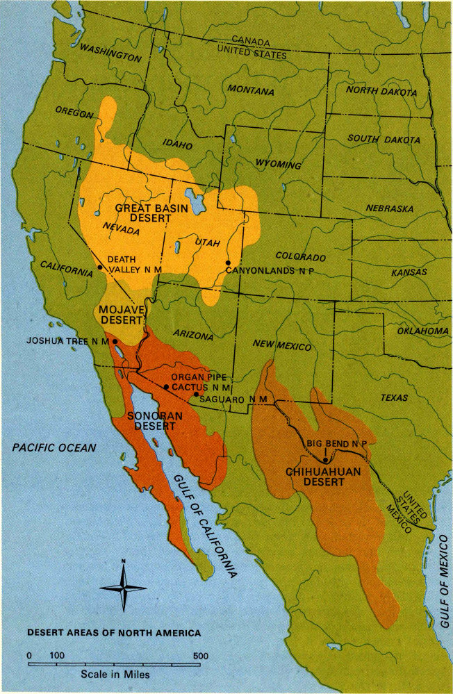 Saguaro National Monument is at the northeastern edge of the Sonoran Desert. Named for the state of Sonora, Mexico, in which the greater part of it lies, this, one of four major deserts in North America, is distinguished by differences in climate and vegetation. The Great Basin Desert, mainly in Nevada and Utah between the Rockies and the Sierra Nevada, has cold winters, sparse precipitation distributed fairly evenly throughout the year, and rather simple vegetation dominated by the low shrubs, sagebrush and saltbrush. Immediately to the south, in southern Nevada and southeastern California, is the Mohave Desert, with cool winters during which most of the year’s precipitation comes, and with plant cover consisting mostly of shrubs such as creosotebush. At higher elevations grows the Joshua-tree, a giant yucca. The Chihuahuan Desert, with cool winters and summer rainfall, covers the broad plateau of north-central Mexico, extending into southern New Mexico and west Texas. Its vegetation consists mostly of small cactuses, spiny shrubs, and succulent-leaved plants such as yuccas.