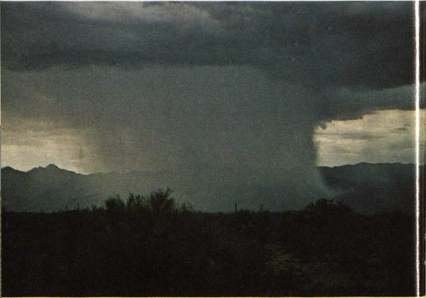 By April, the East Pacific high has returned far enough northward to resume its control of southwestern weather. Now the fore-summer drought sets in, intensified by gradually rising temperatures. Day after day the sun climbs higher in the sky, baking the earth and testing the endurance of desert life. Then, sometime in late June or early July, clouds begin forming in the afternoons over the mountains; finally, one day they build up to great thunderheads. The drought ends suddenly as rain pours down and lightning cracks the sky. Down the canyons and along the desert washes rages the water, brown with soil. In a short time, the storm 10 is over, and the water disappears into the ground. Just 1 mile away, rain may not have fallen.