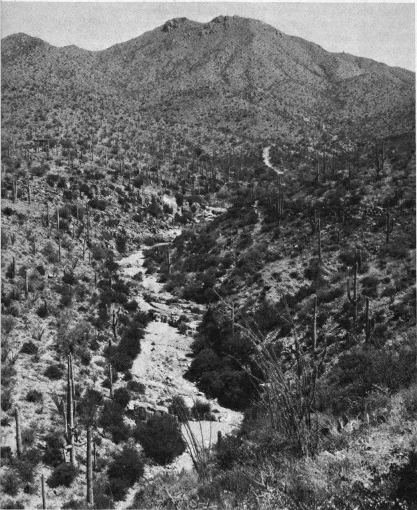 Chiminea Creek, originating in the higher elevations of the Rincon Mountains, forms a ribbonlike oasis of hydrophytic plants, including large trees such as sycamore, walnut, and cottonwood.