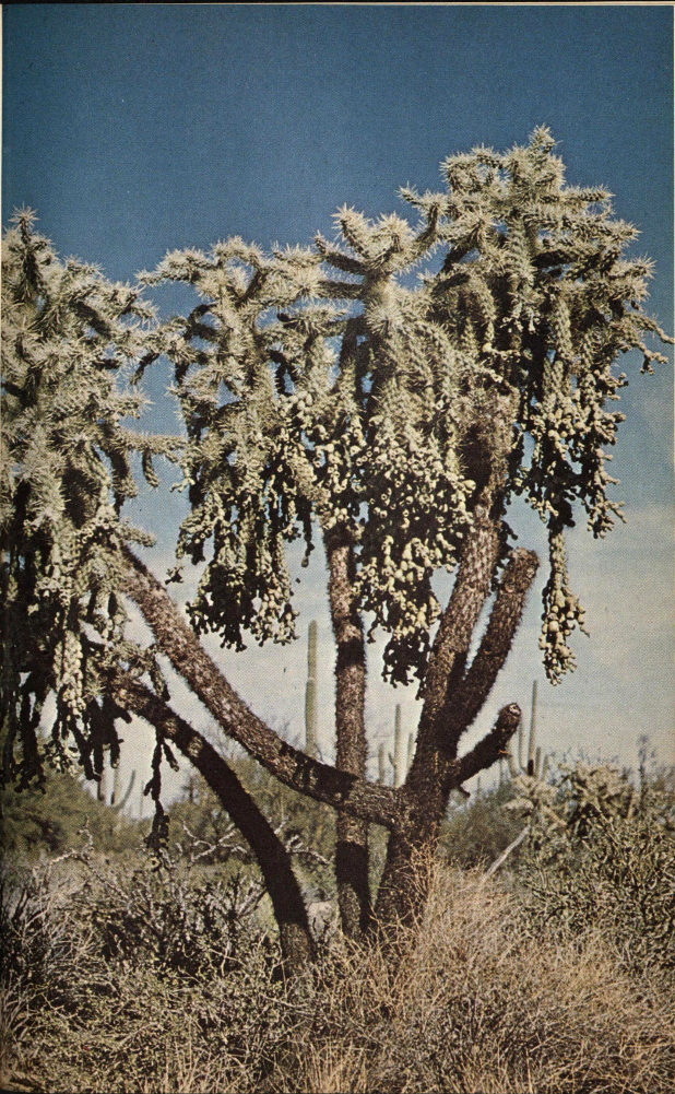 On the higher mountains of the Sonoran Desert, however, exist species with an entirely different ancestry. Most of the plants of the pine and fir forests of these high places, like the plants of the Great Basin Desert, derive from the Arcto-Tertiary Flora, which dominated the northern part of our continent during Tertiary times. As climate changes, one or the other of these great plant assemblages will benefit at the expense of the other. If cooler, wetter periods return, as they did during the Pleistocene epoch, ponderosa pines, now found above 6,000 feet, may again grow nearly as low down as today’s cactus forests. But if the present long-term drying trend continues, the northern plants will eventually be squeezed off their mountaintops.
