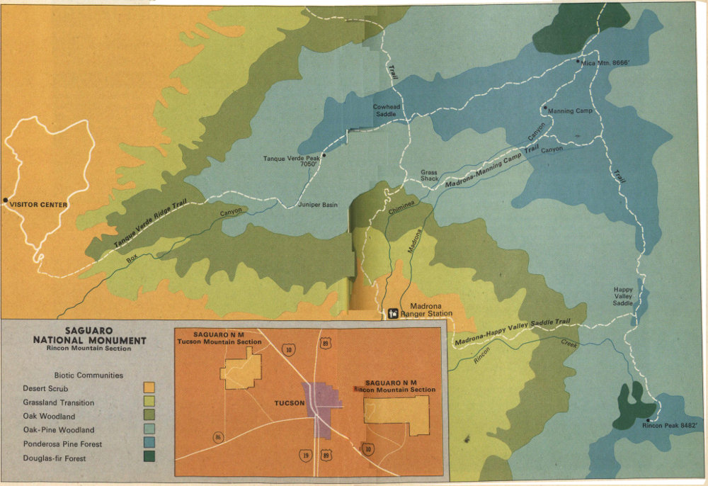 In southern Arizona, the sequence of vegetation types begins with desert scrub at the lowest elevations, and ranges through desert grassland, oak woodland and chaparral, oak-pine woodland, ponderosa pine forest, and Douglas-fir forest, to Engelmann spruce forest on top of the highest mountains. In the national monument, we have all these types except the last—although desert grassland is poorly represented here because the steep slopes squeeze it into a narrow altitudinal band; and Douglas-fir forest is restricted to small areas in canyons and on north-facing slopes at high elevations. A few drainageways (notably Chiminea Canyon, on the south side of the monument) support patches of deciduous trees classified as riparian woodland.