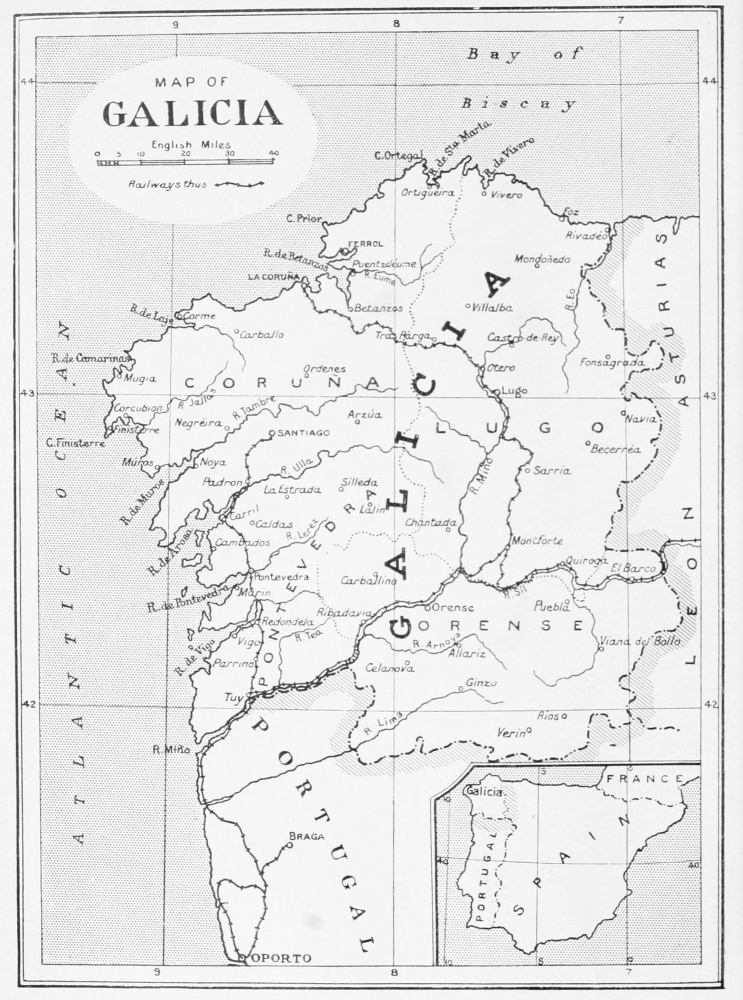During the eighteenth and nineteenth centuries Galicia seems to have been left out of count, and to have gradually sunk into oblivion. Even the Spaniards themselves know very little about her to-day. Yet in the Middle Ages her fame as a goal of pilgrims rivalled that of Palestine, not only throughout Spain, but throughout the length and breadth of Christendom; while earlier still, when she bravely resisted Julius Cæsar’s attempt at conquest, she won for herself no little glory.