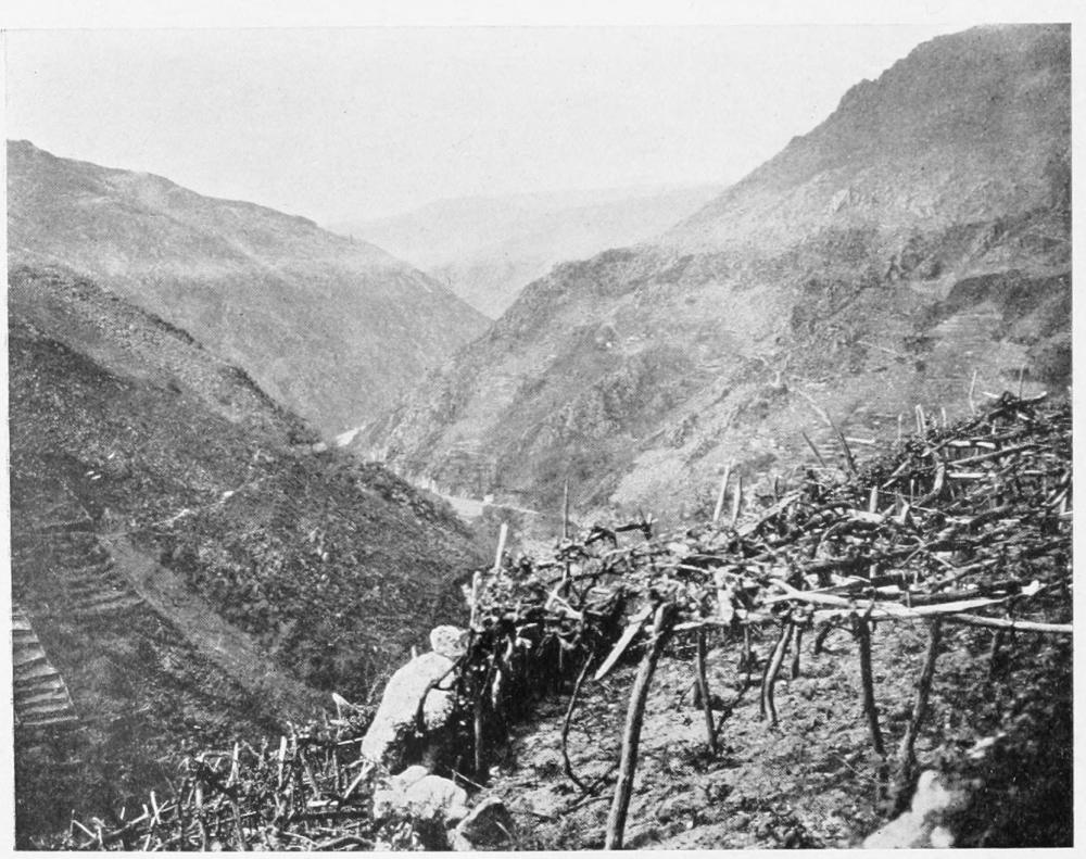 Right down to the seashore the ground is remarkable for its spontaneous vegetation, which is in itself a cause of the richness of the soil. Every kind of fruit tree known to Europe thrives upon the lower slopes of the ever-verdant valleys, the fruit upon the higher slopes ripening twenty days later than that upon the sea-level. Woods of oak and chestnut cover the hillsides, and pines dominate the loftiest crags of the mountain peaks. Within a radius of ten miles my eyes have rested upon pine-clad mountain scenery wild and beautiful as that of Norway, and upon a riviera of vegetation like that of Mentone, embracing the orange, the cactus, the olive, the fig, and even the lemon tree laden with its ripening fruit. The sides of the narrow and undulating valleys are often entirely vine-clad; the steeper slopes, cut into terraces, are planted with potatoes, cabbages, or bristle-pointed oats. Sometimes a mountain-side appears as if it were provided with a majestic flight of verdant steps cut in its side from base to summit.