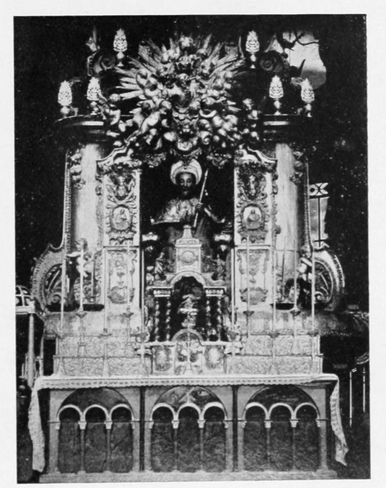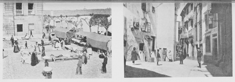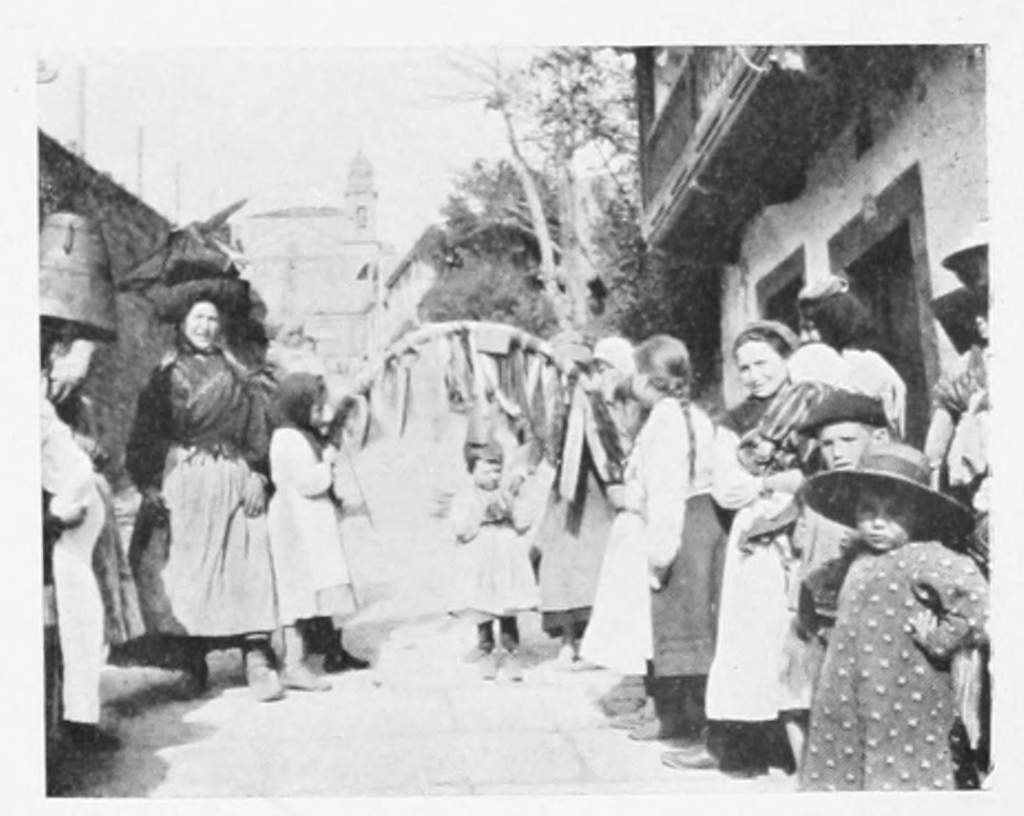 GALICIA is bounded on the north by the Bay of Biscay, on the south by Portugal, and on the east by the provinces of Asturias and Leon. This province is the most westerly and at the same time the most northerly part of Spain, and her cape—Finisterre—was once the uttermost part of the Roman Empire. It was from the Romans that Finisterre received its name, “the End of the Earth.” The Pyrenees, which extend along the whole of northern Spain, have their last ramifications in Galicia, meeting the Atlantic Ocean at Cape Finisterre.[28] If we place our hand flat upon a table with palm downward and fingers and thumb outstretched, the thumb pointing northwards and the middle finger due west, we have before us a rough idea of the configuration of Galicia. The back of the hand, the highest part, represents the mountains of moderate altitude which form the centre of the province, while the outstretched thumb and fingers represent the ridges into which these mountains divide as the Atlantic Ocean is approached. The waters of the Ocean run inland between each finger of the Pyrenees, forming a wide and beautiful Ria, such as in Scotland we should call a loch, and in Norway a fjord. But here the similitude to the human hand ends, for the beautiful bends and curves of the rias, their snake-like insinuations landward among the mountain slopes, bear no likeness to the straight lines of the human finger. The four principal inlets are called Rias bajas; they are the Ria de Muros, the Ria de Arosa, the Ria de Pontevedra, and the Ria de Vigo. The seacoast formed by these Rias and the smaller inlets to the north of them is so dangerous to ships that sailors call it “the coast{18} of death.” Many an English vessel has been lost on that coast—indeed, two ships from our shores met with disaster there in the year 1907. But a reform which has long been demanded by England seems at last about to be carried out. Señor Besada, Minister of Public Works, and one of the most eminent men in the Conservative party, is, we are told, about to give instructions for the provision of luminous buoys and fog-signals at the points of danger. A Commission of Engineers has already been nominated to study the question. It is here that the furious waves, working like yeast, break against the half-hidden rocks, and, rising to a stupendous height, swoop down upon them with thundering noise even in the most smiling weather. It is here that corpses of unfortunate fishermen are so constantly washed ashore that the local papers announce such events almost without comment. It is truly most appropriate that San Telmo, the patron saint of all Spaniards who go down to the sea in ships, should have had his birthplace in Galicia,[29] Spain’s breakwater against the Atlantic.[30]